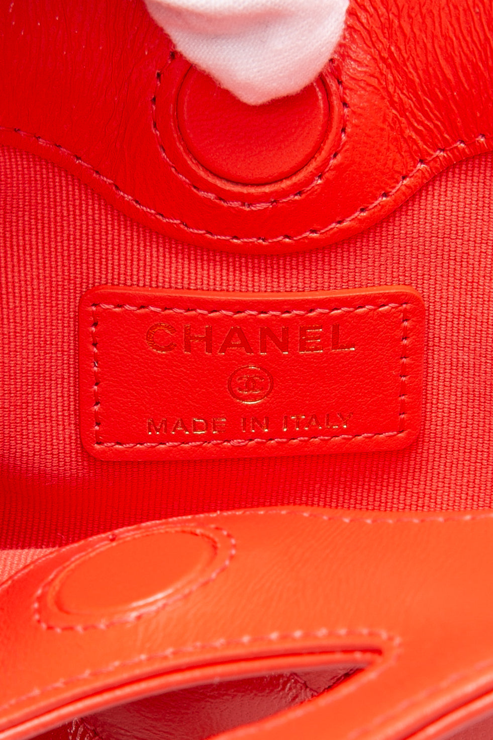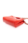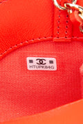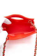 This clutch is crafted with shiny lambskin leather in coral red. It features a gold chain-link leather threaded shoulder strap, a gold Chanel CC logo, a cut out top handle, and opens to a coral red fabric interior.
