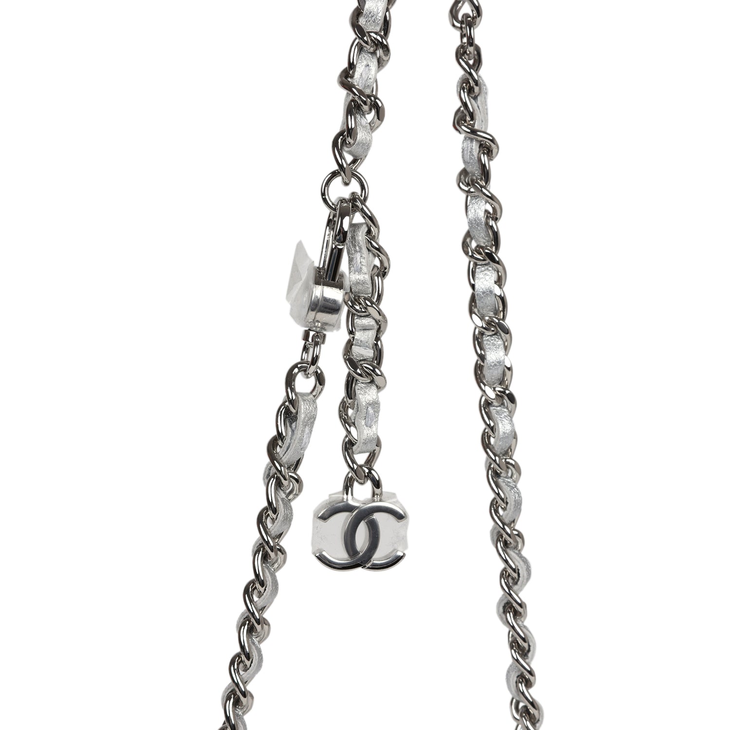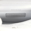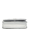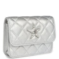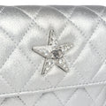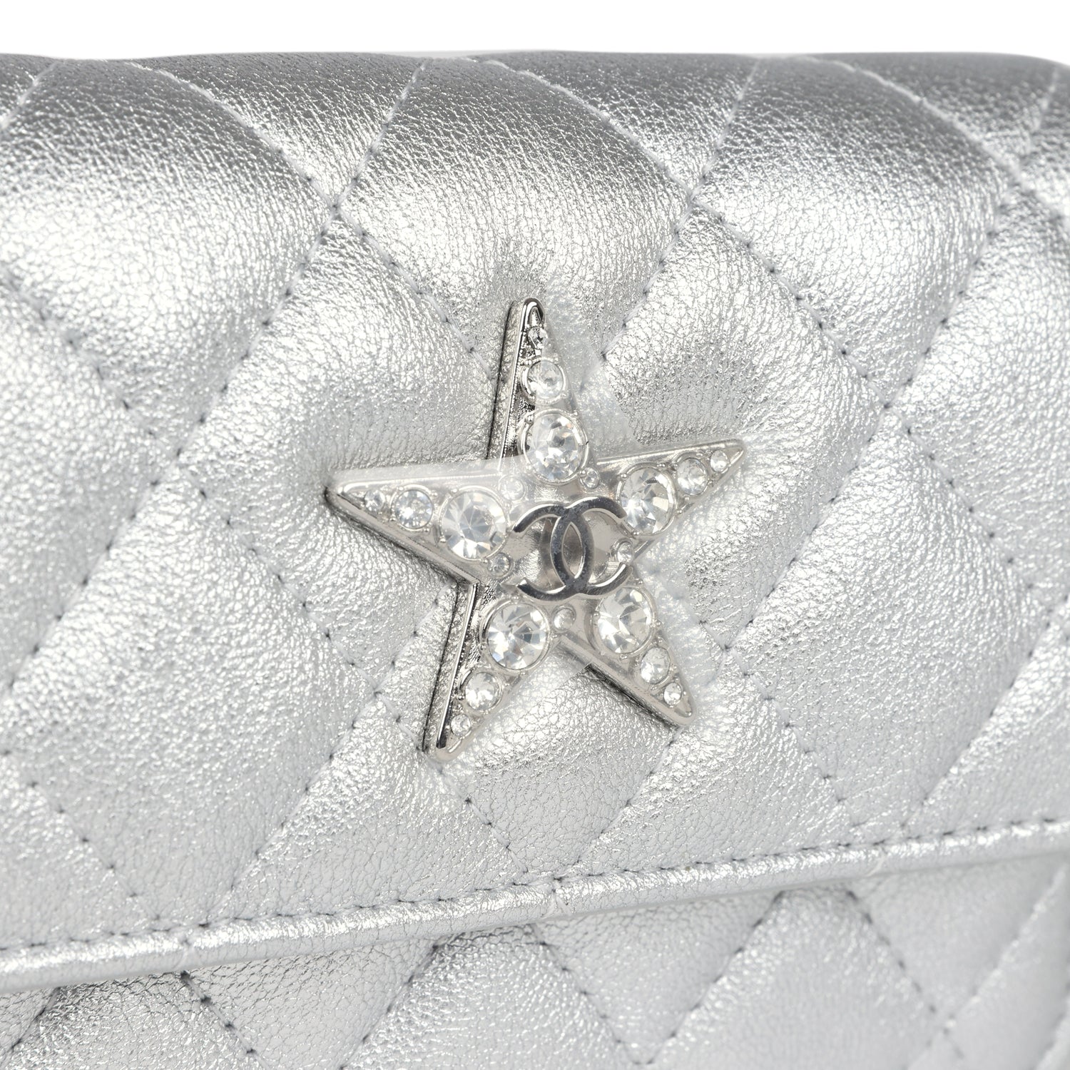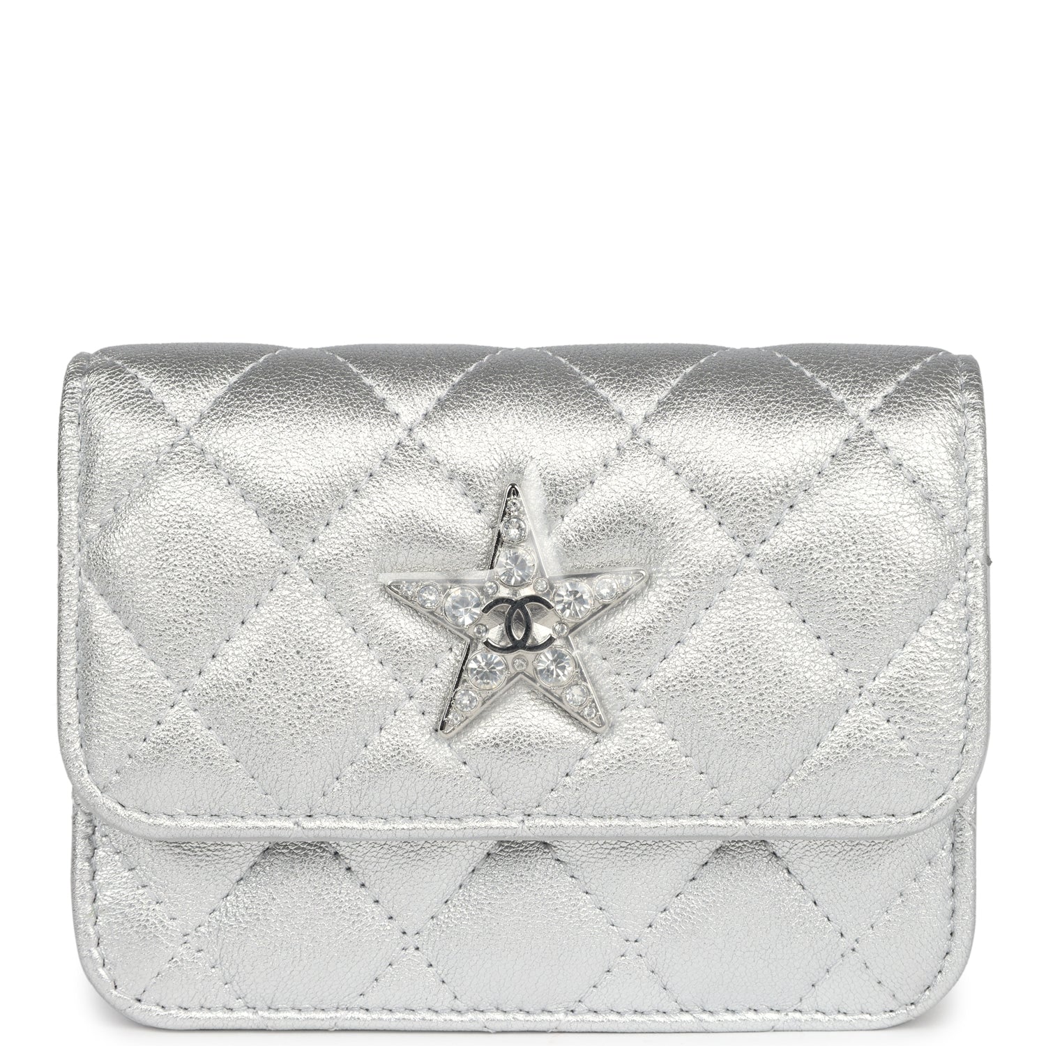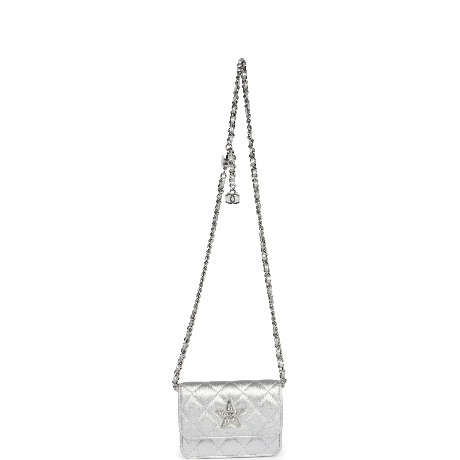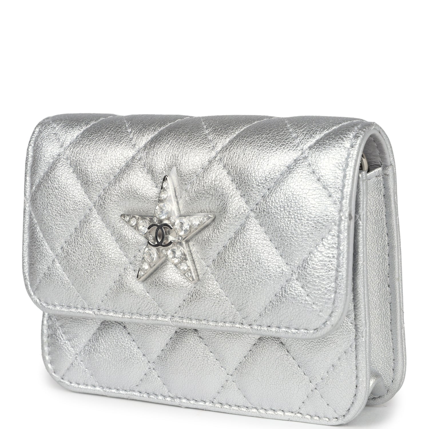 This Chanel Walk of Fame clutch is in silver metallic quilted goatskin with silver hardware, with a signature CC front snap closure which features a crystal star motif on front flap and an interwoven silver plated chain link and silver leather strap that can be converted into a belt flap bag.