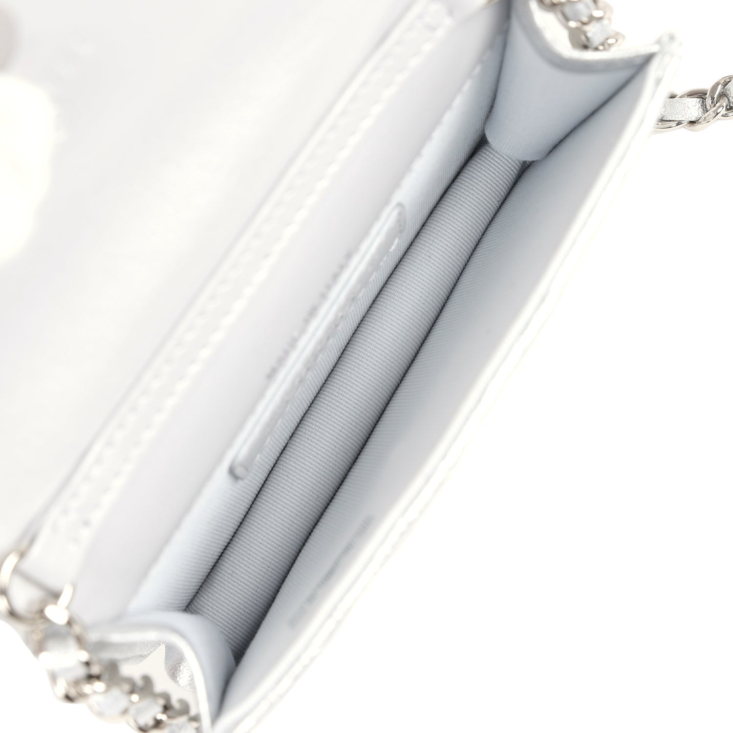 The interior is lined in silver fabric and has no pockets.