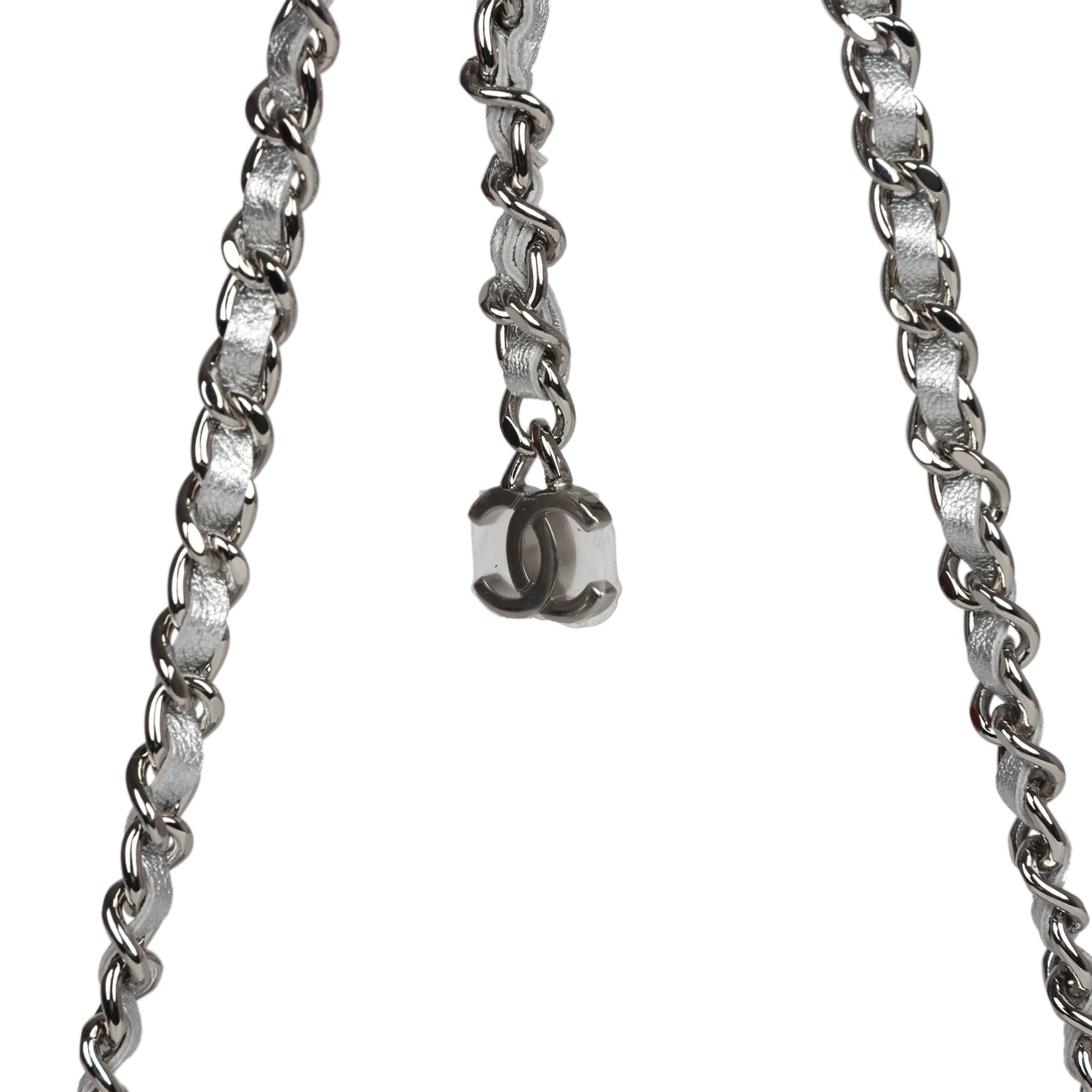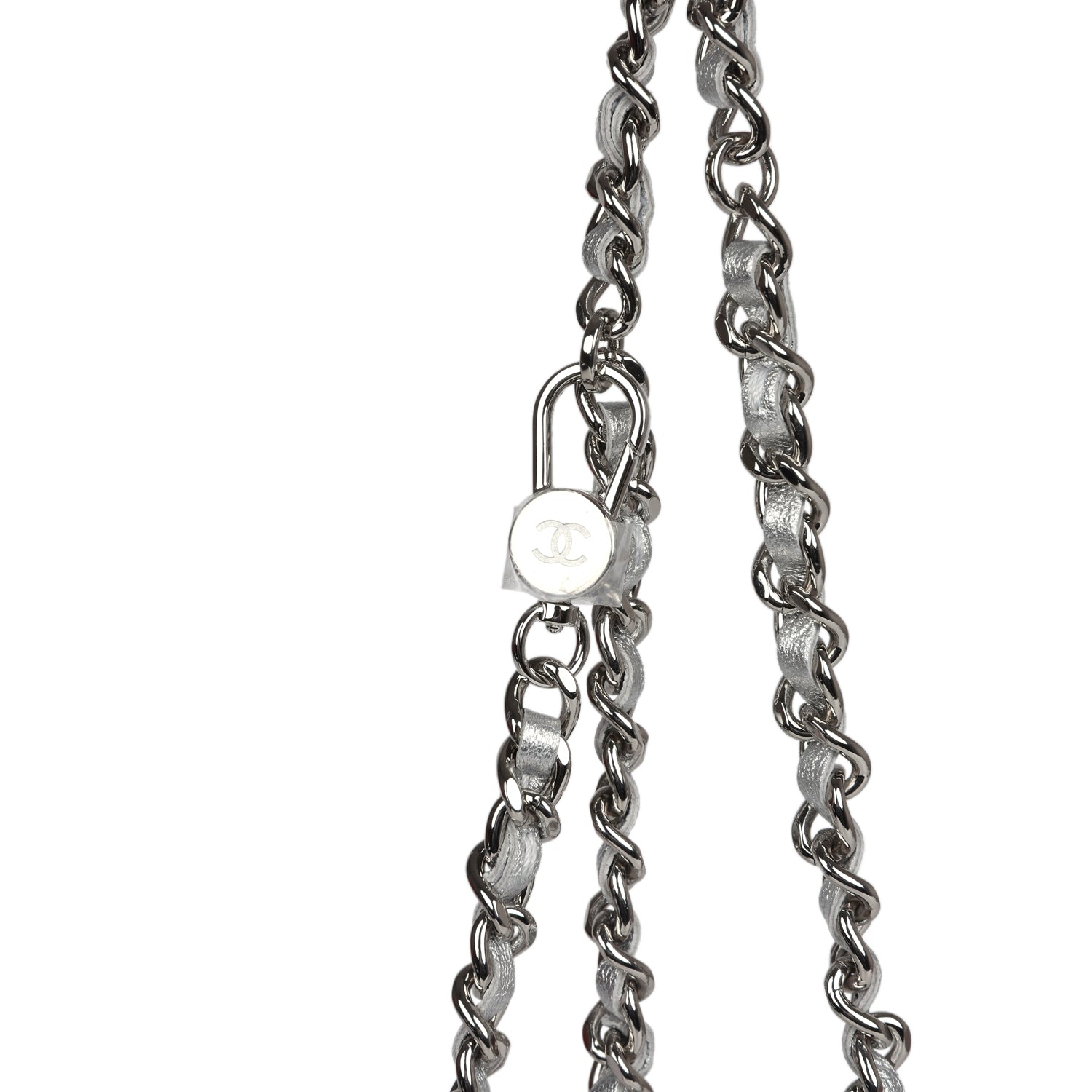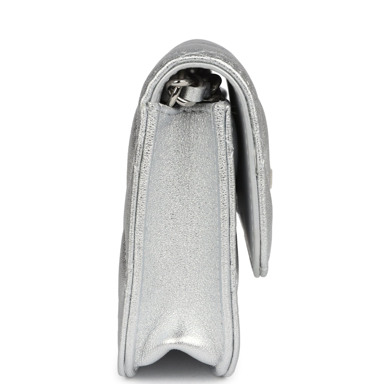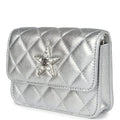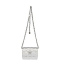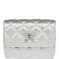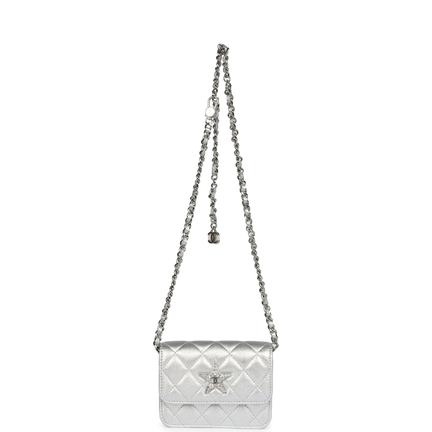 This Chanel Walk of Fame clutch is in silver metallic quilted goatskin with silver hardware, with a signature CC front snap closure which features a crystal star motif on front flap and an interwoven silver plated chain link and silver leather strap that can be converted into a belt flap bag.