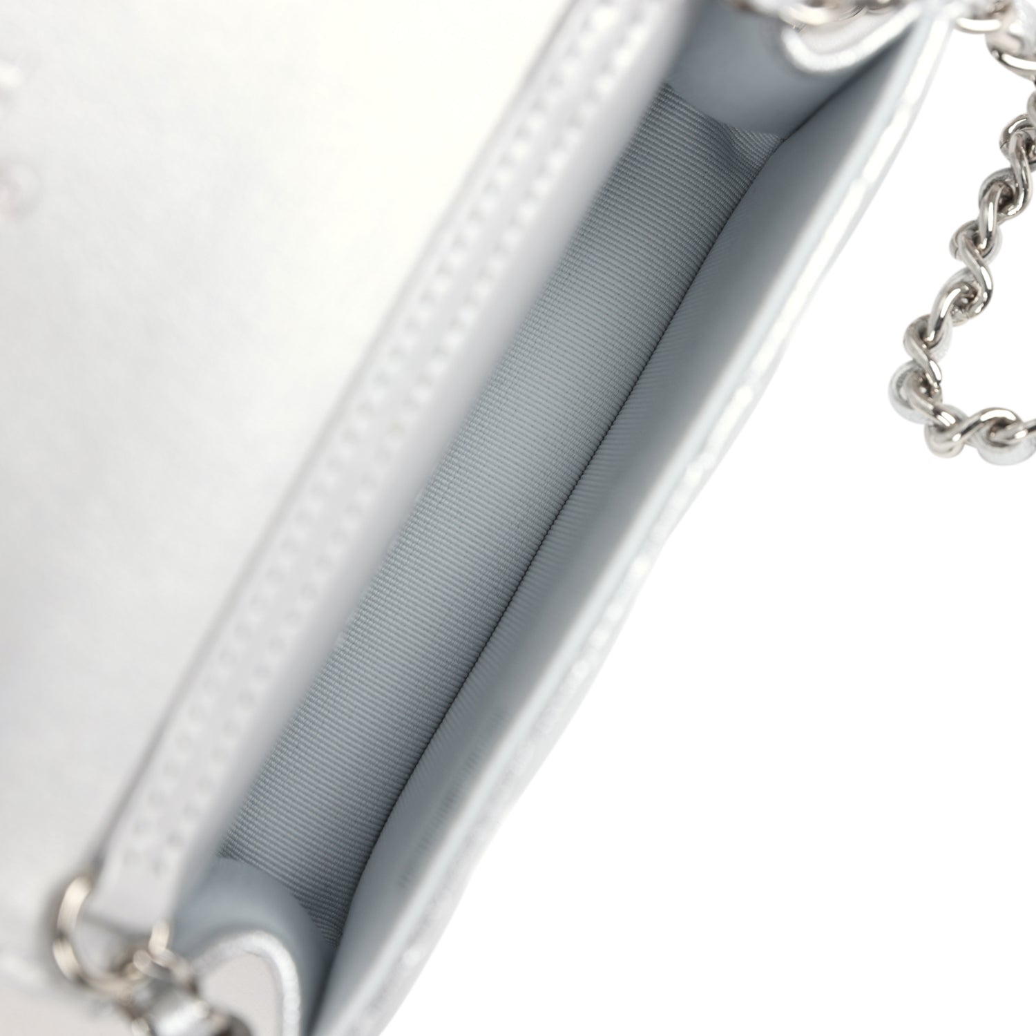The interior is lined in silver fabric and has no pockets.
