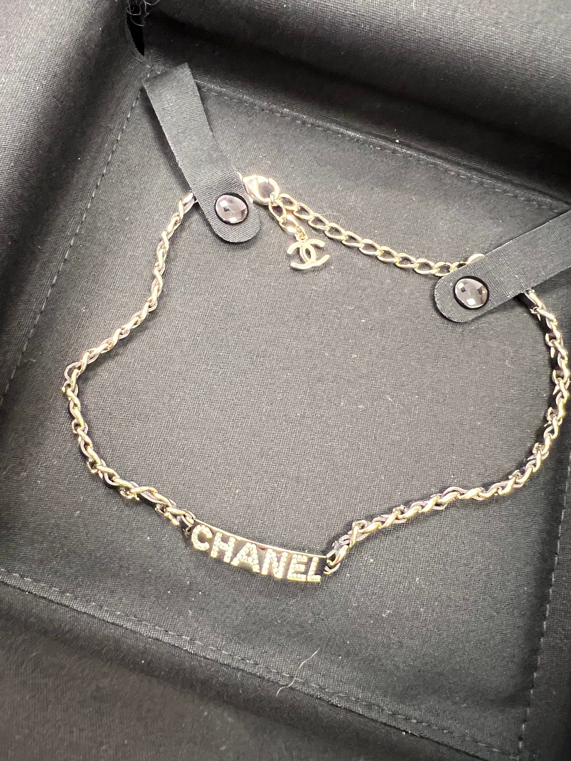 Description: New in box, Chanel Crystal Tag Choker GHW. Full set.