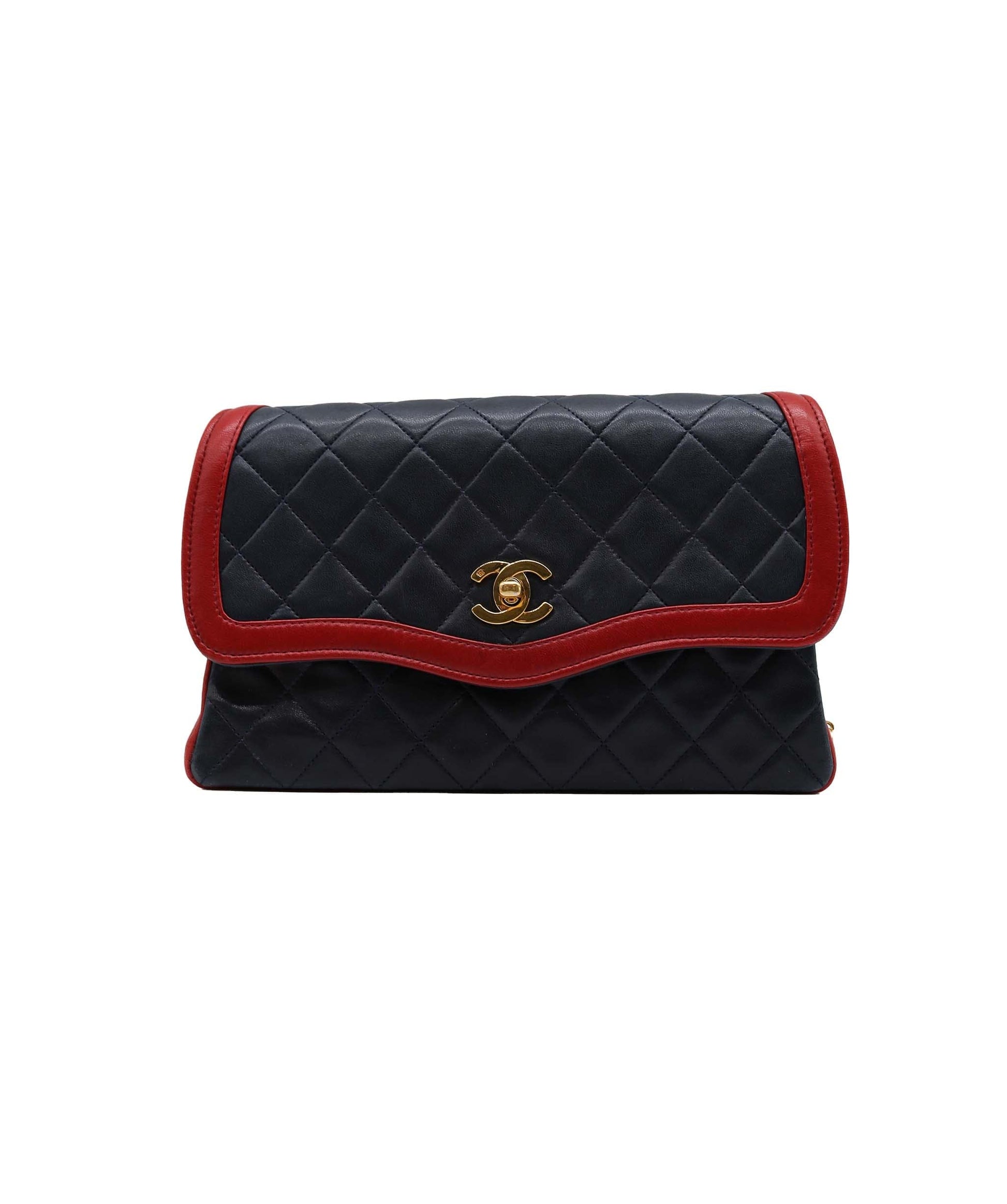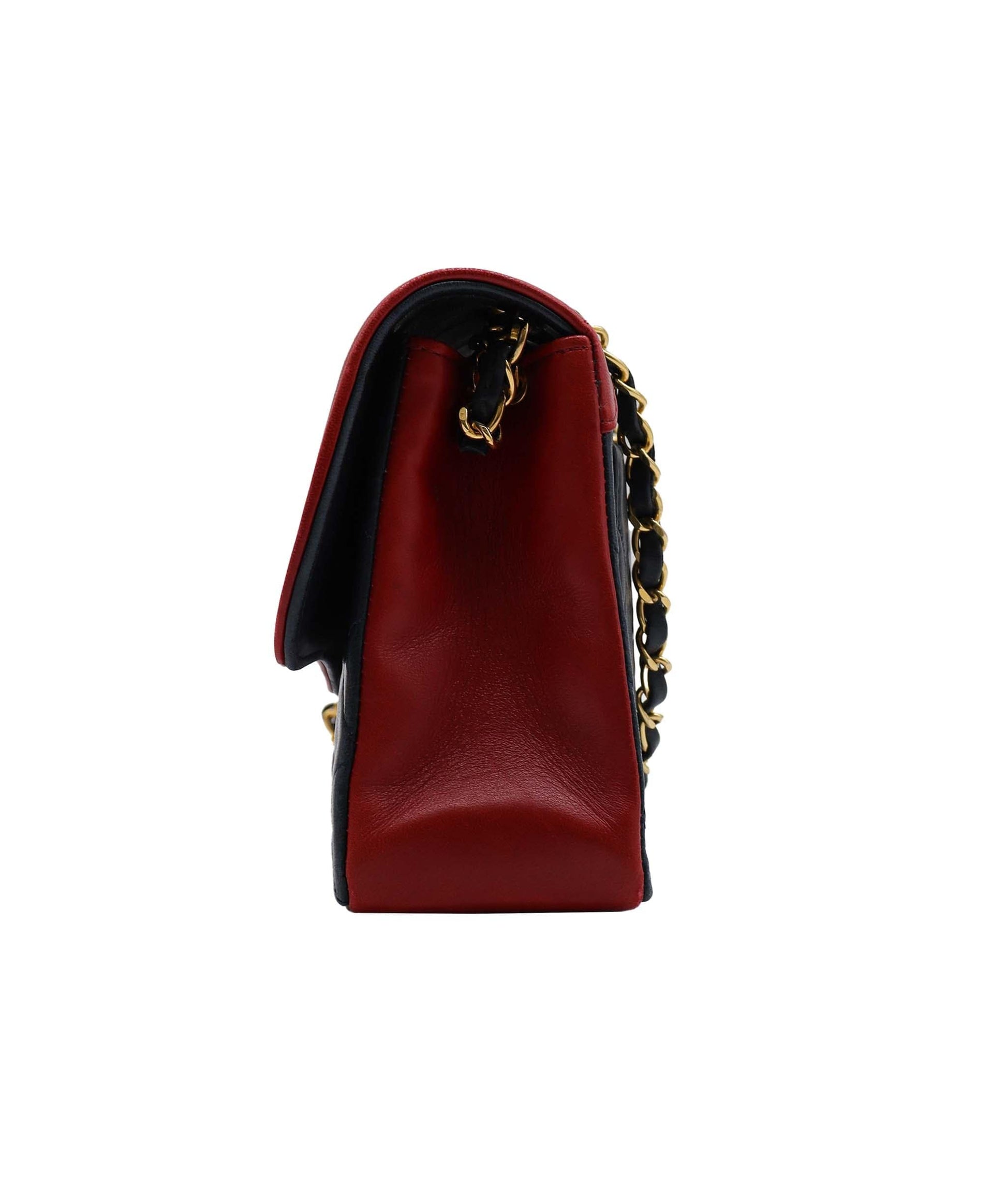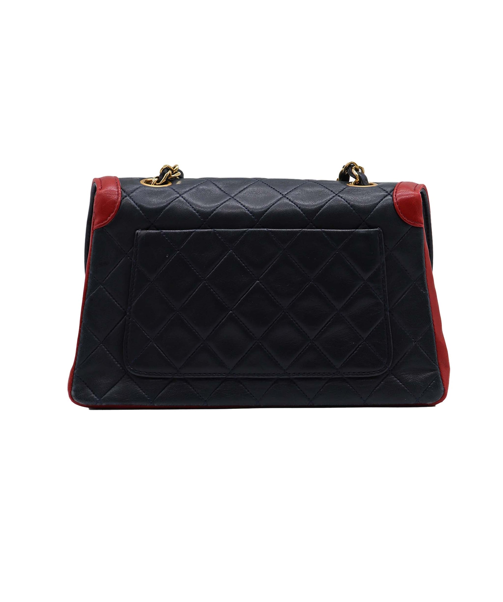 Description: This striking iconic Chanel Bi-colour Classic Double Flap shoulder bag is crafted in color blocked navy and red with a diamond-quilted lambskin, and accented with gold-tone 'CC' turnlock and chain hardware.