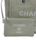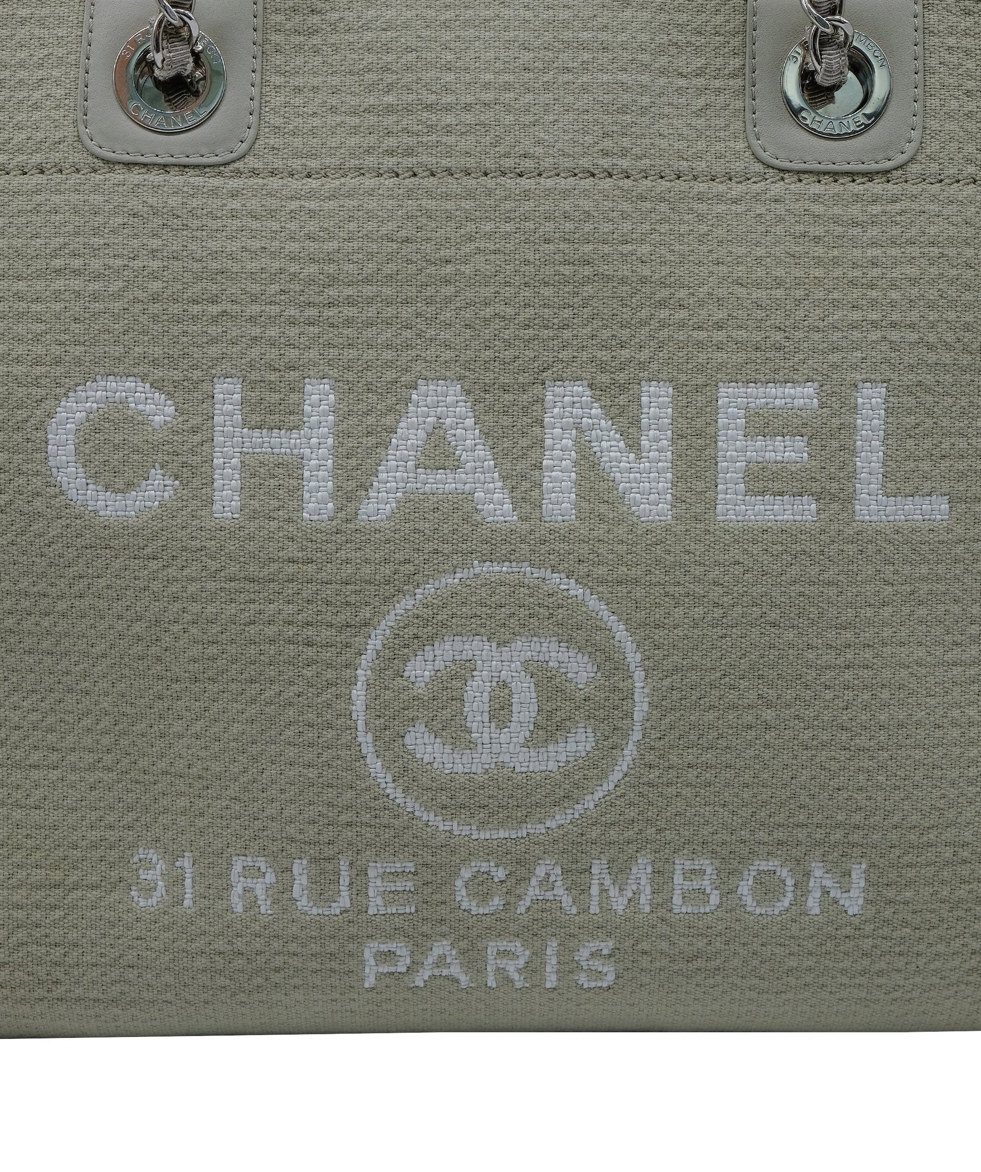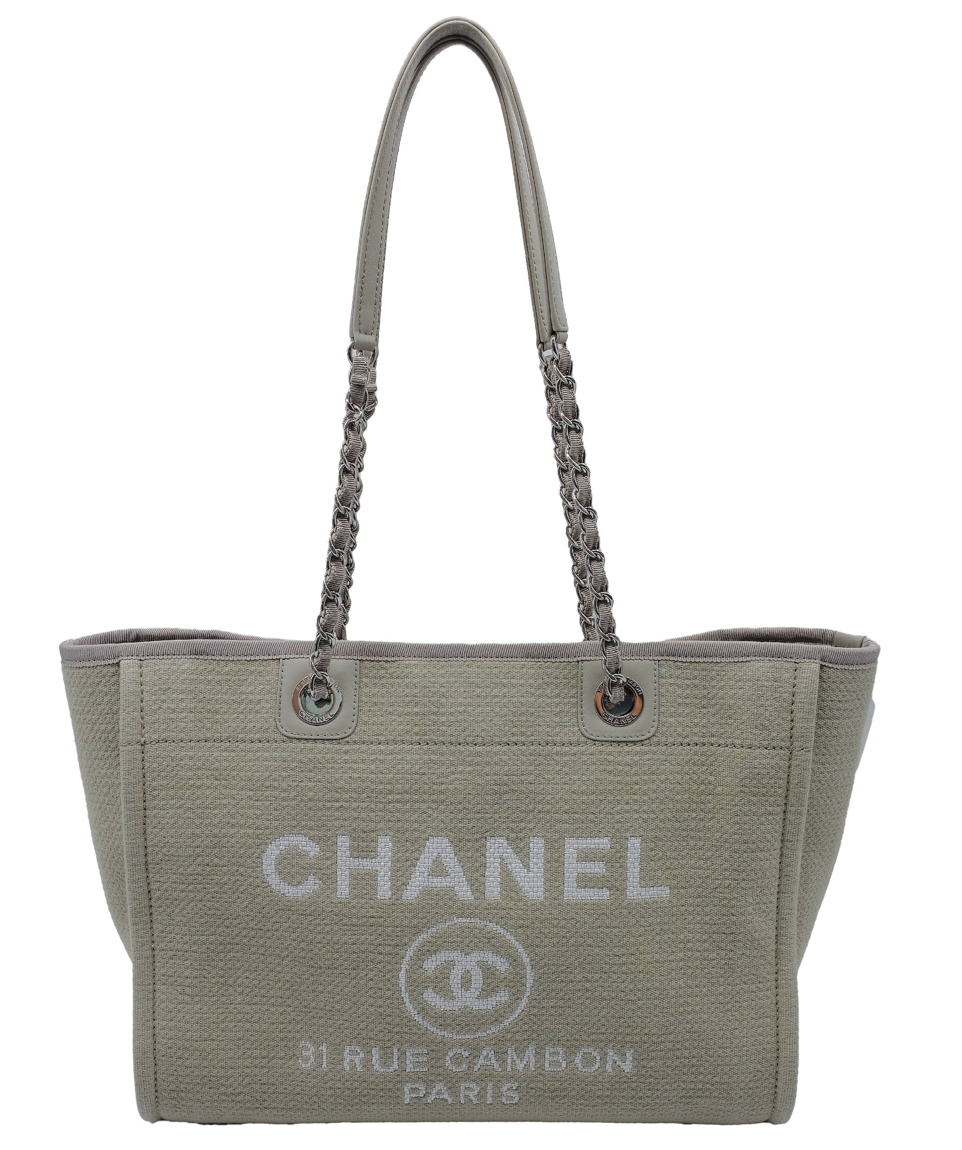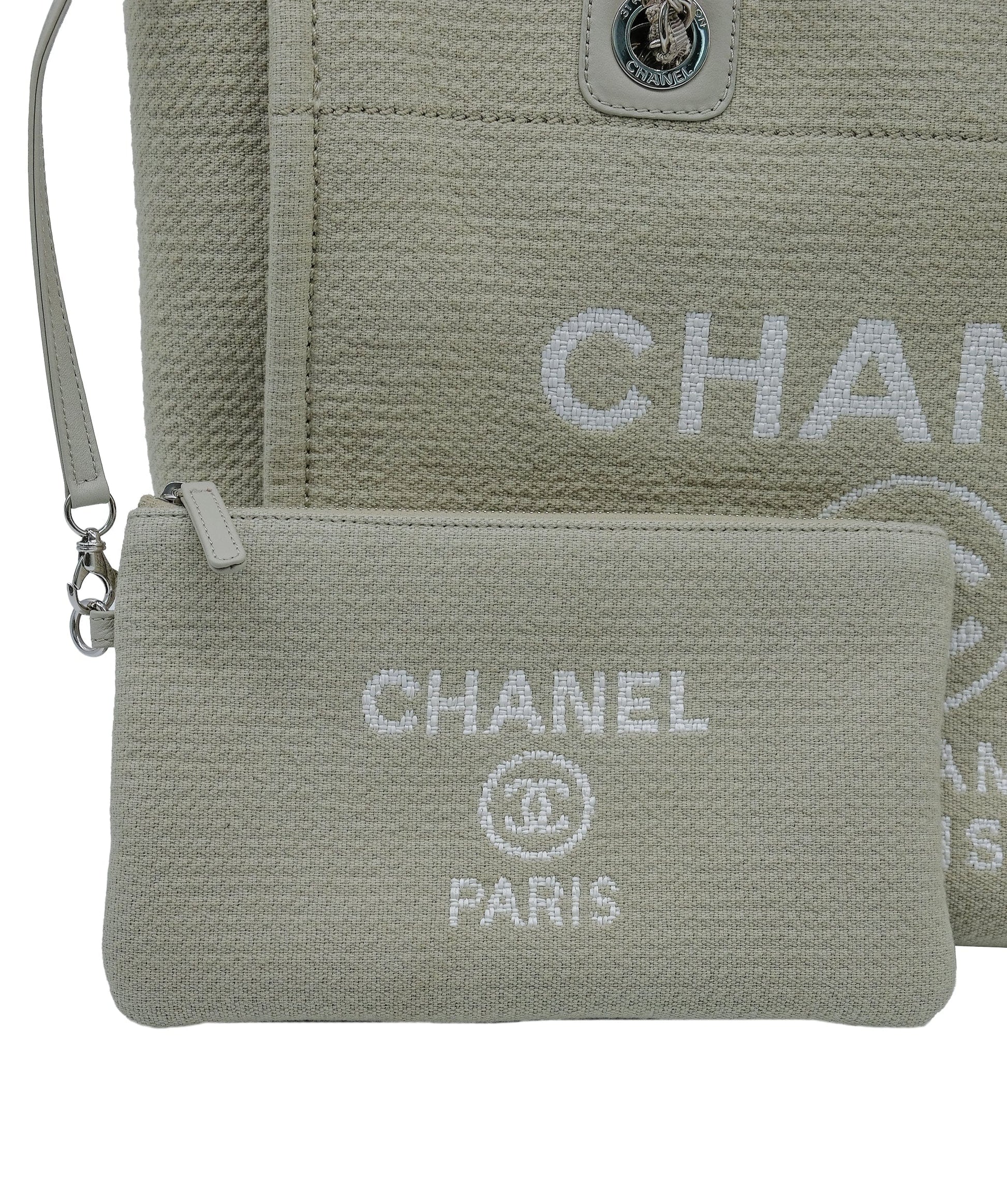 Shop this Chanel Deauville Beige Tote at Luxury Promise now. This Chanel Tote is crafted from canvas leather in a beige colour and finished with silver hardware. This Chanel bag features a spacious compartment to fit all your favourite belongings and makes the perfect travel bag. Comes with a removable pouch. New condition.