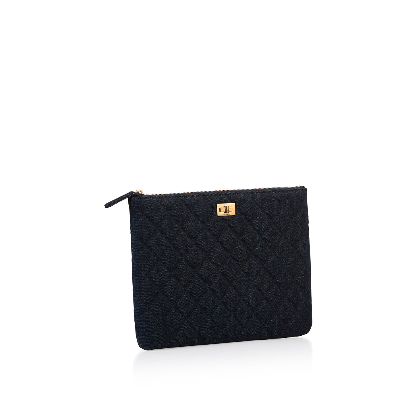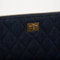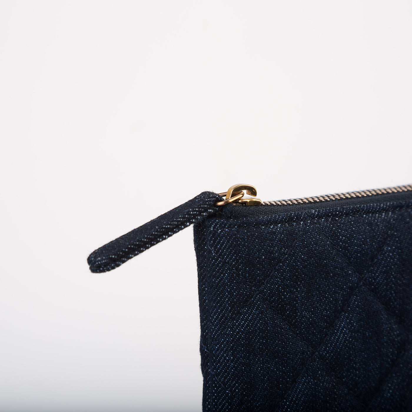 Crafted from dark blue denim, Chanel presents their stunning Re-Issue O-case pouch. With the Re-Issue's signature twist lock clasp in gold tone hardware, this piece is sleek, stylish and sophisticated. Wear this piece with any casual look, from a basic tee and a pair of trousers to black jeans and a simple blouse. The ideal every day clutch, the Re-Issue clutch is understated and elegant while remaining timeless and fashion forward.