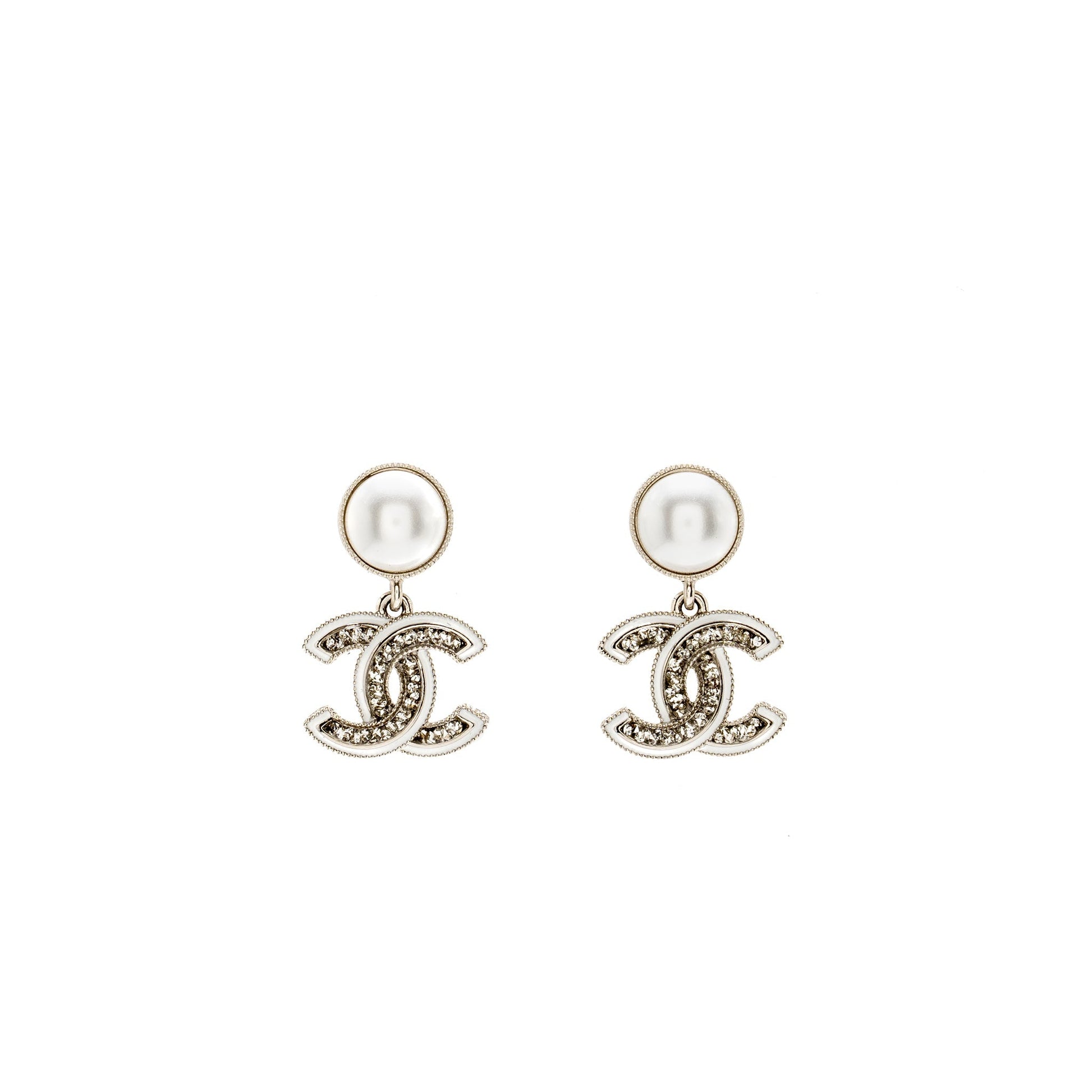 Chanel CC Drop Earrings Pearl/Crystal Silver Tone