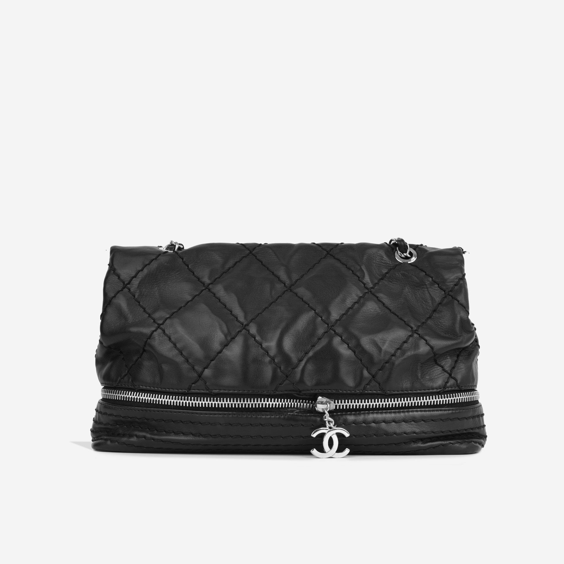 Introducing the Chanel Expandable Ligne Flap Bag, a versatile accessory designed to adapt to your needs. Crafted from black smooth quilted calfskin, this bag exudes elegance and sophistication. What sets it apart is its unique feature: an expandable base with zipper closure, allowing you to adjust the bag's capacity as needed. Perfect for travel or daily commutes to work, this bag combines style with functionality, making it a must-have addition to your collection.