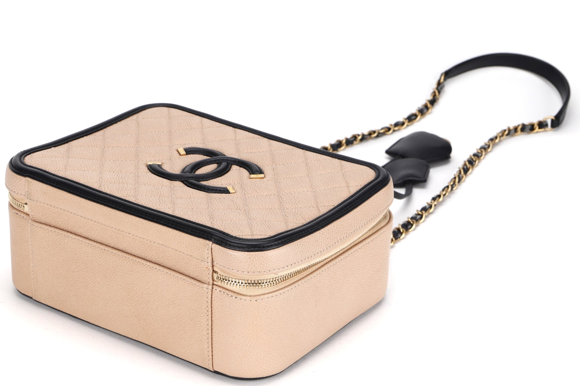 CHANEL FILIGREE VANITY CASE (2805xxxx) LARGE BEIGE & BLACK CAVIAR LEATHER, WITH , LOCK, KEY & DUST COVER
