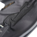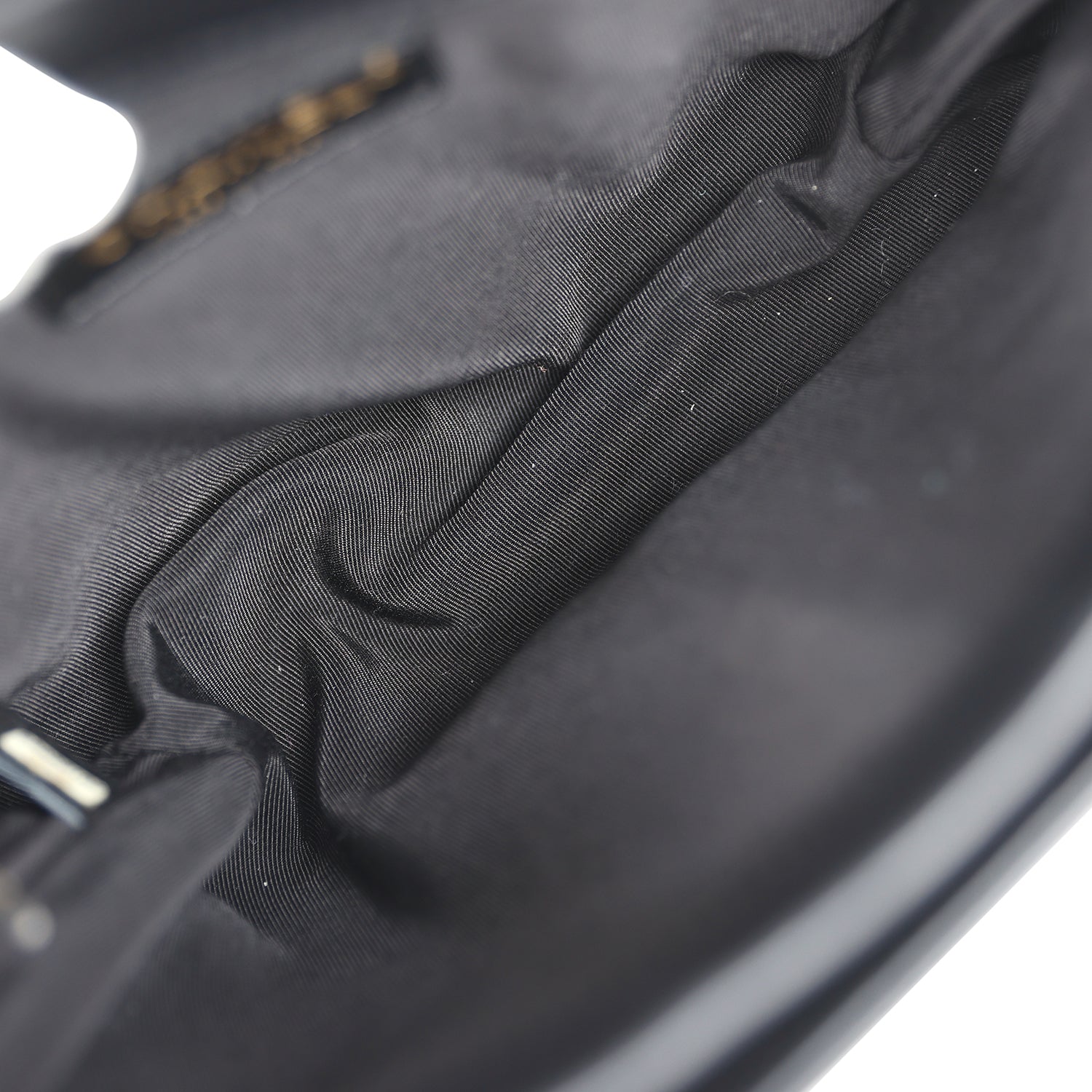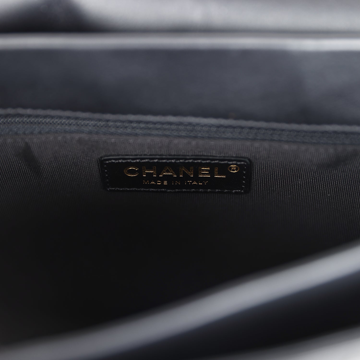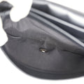 The interior is lined in black grossgrain fabric and has three interior main pockets; one zippered pocket in the middle compartment.