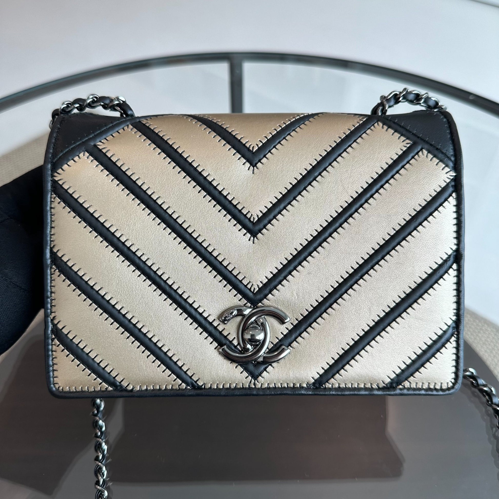 Flap Couture Chevron Stitched Gold Black Cross Body SHW No 23