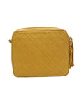 Chanel shoulder bag in a bold mustard yellow leather, featuring quilted diamond stitching on the front, which is a classic design element of many Chanel bags