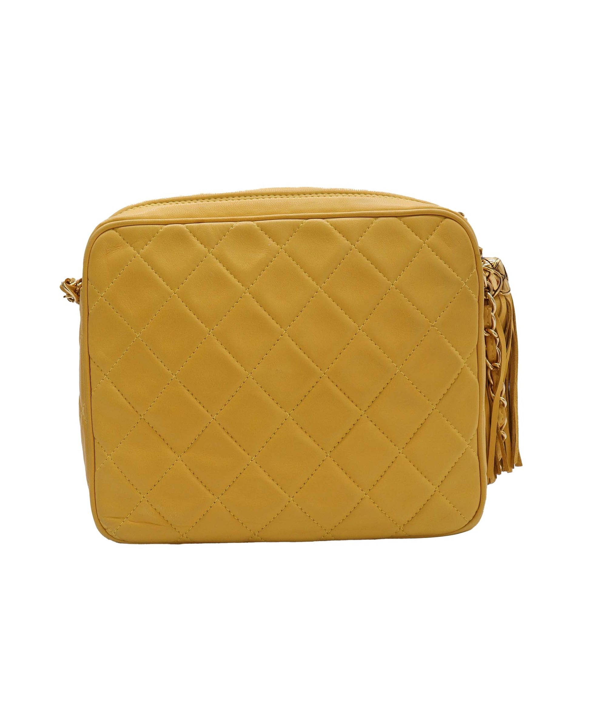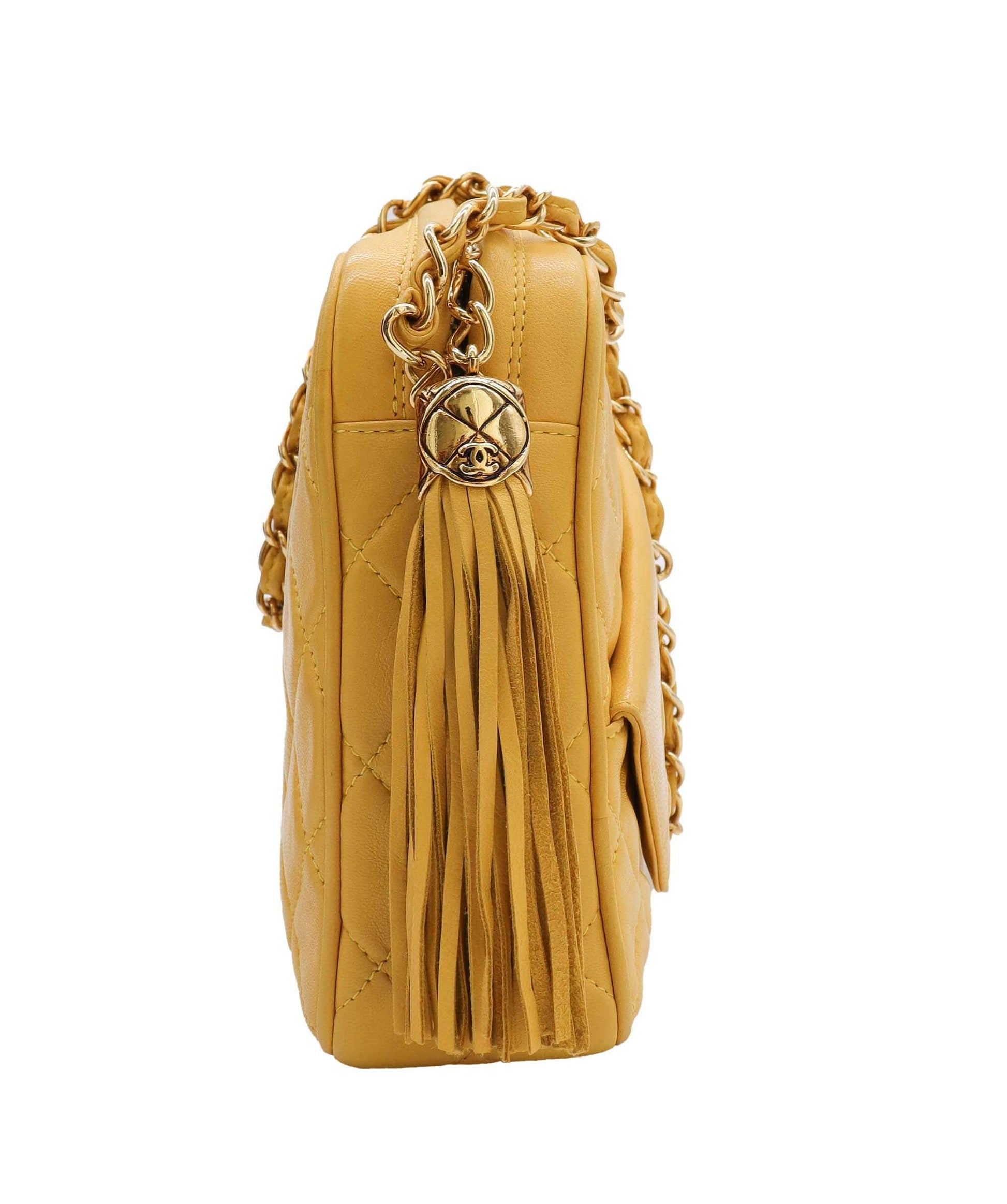 this mustard yellow Chanel bag has a vibrant and eye-catching design. The combination of the tassel detail, the quilted leather, and the embossed "CC" logo on the front pocket flap makes it a distinctive and stylish accessory. The condition appears New, with both the leather and hardware looking pristine.
