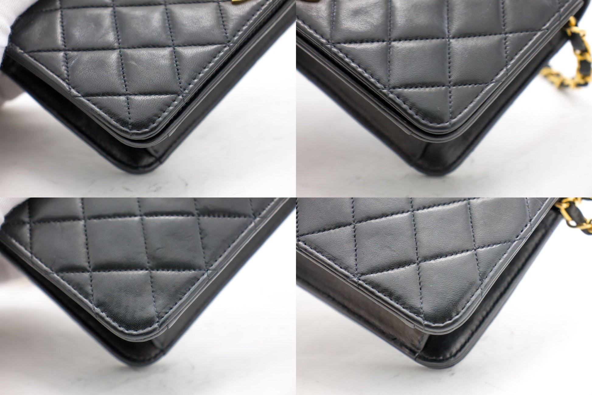 Overall: 8 of 10 - The outside is in excellent condition with minimal signs of use only. Slight scratches. The inside is also excellent and very clean with slight scratches. No stickiness or peeling. All chains and hardware are shiny and excellent. Highly recommended!