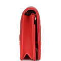 This Gabrielle Wallet on Chain is in Red Aged Calfskin with Mixed Metal Hardware, tonal stitching, front flap with lambskin border and CC emblem, and an interwoven red leather and mixed metal strap.