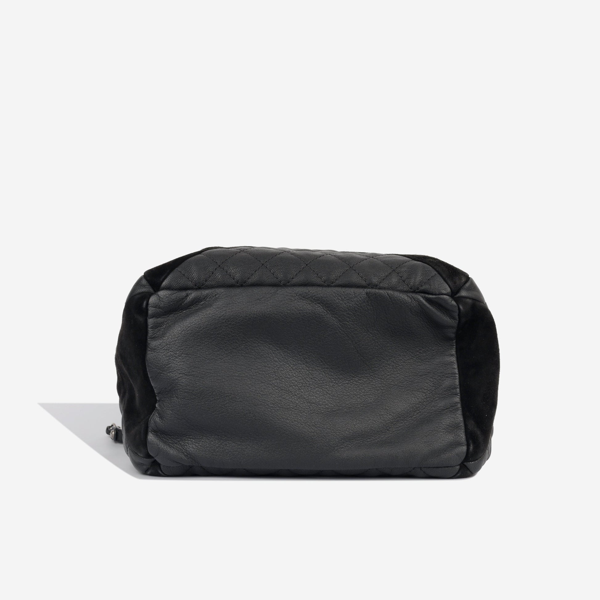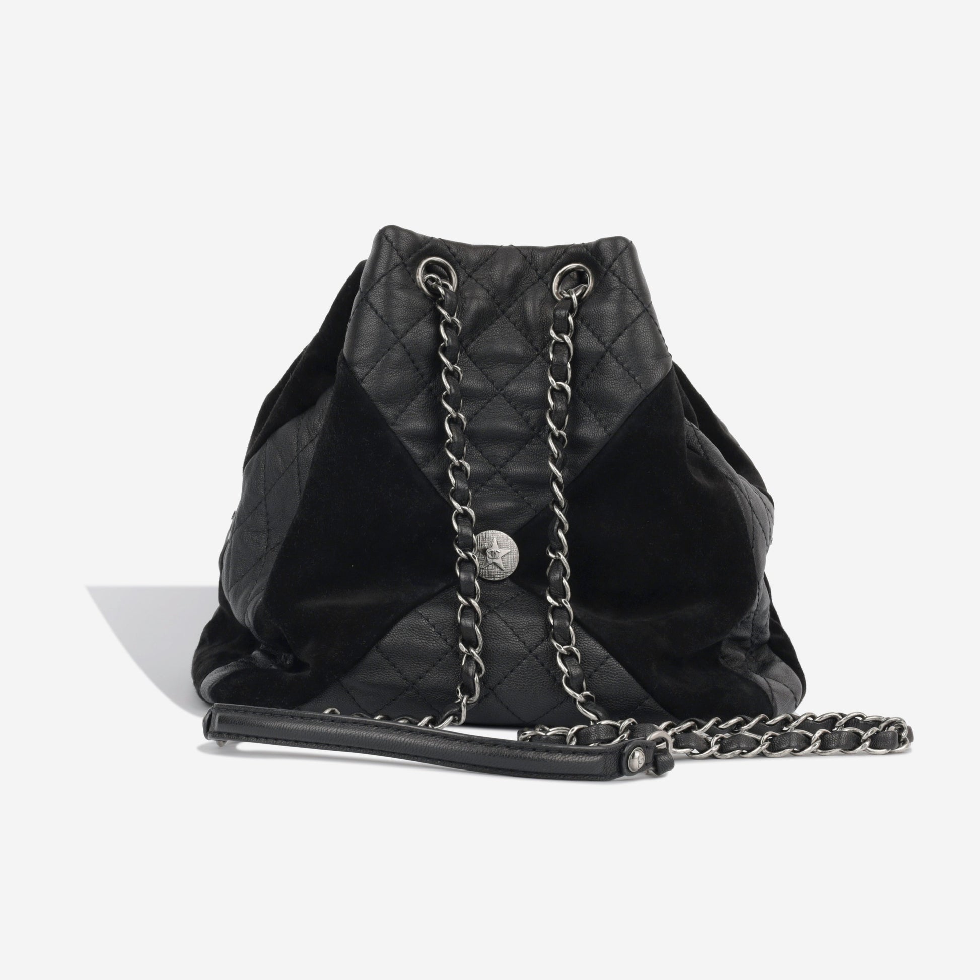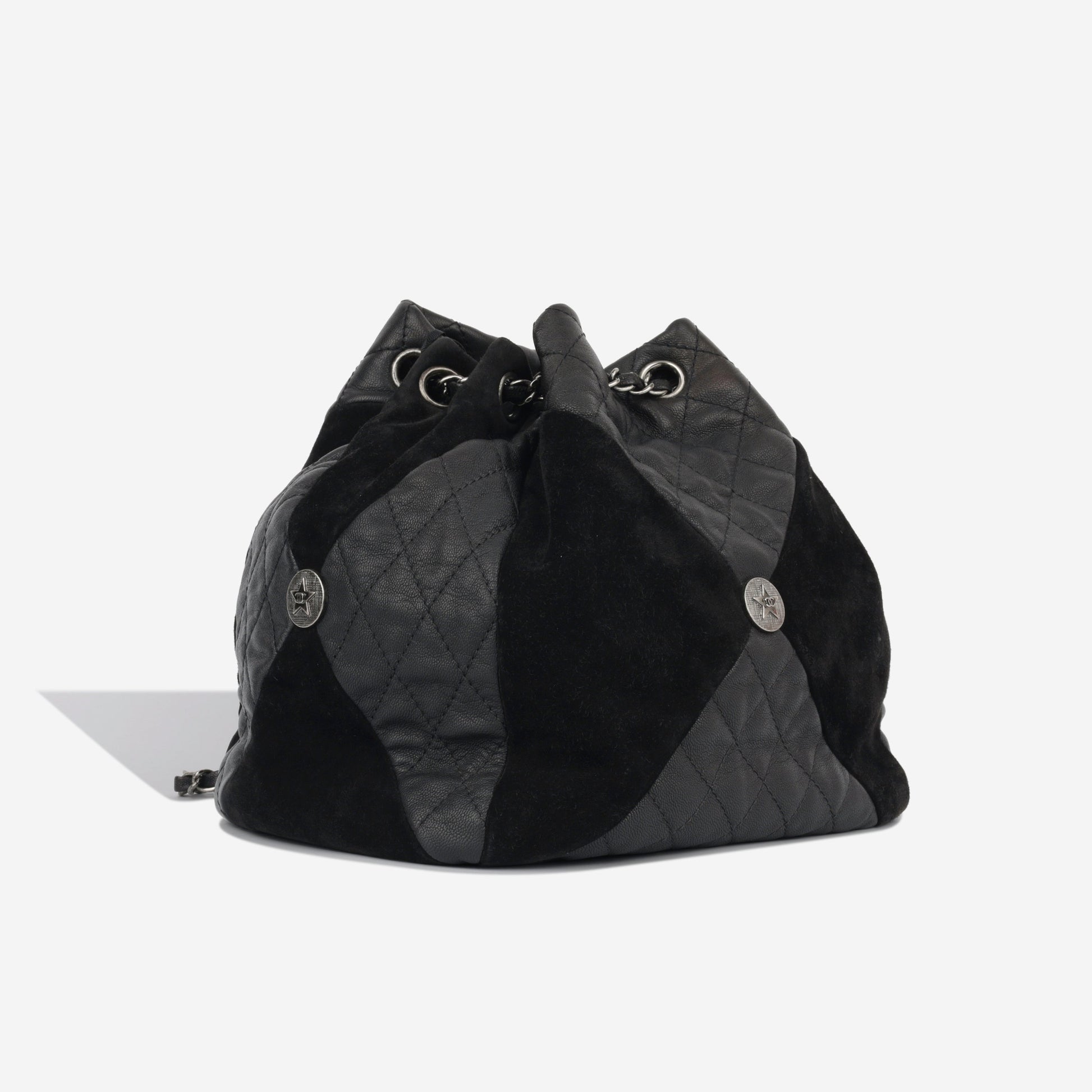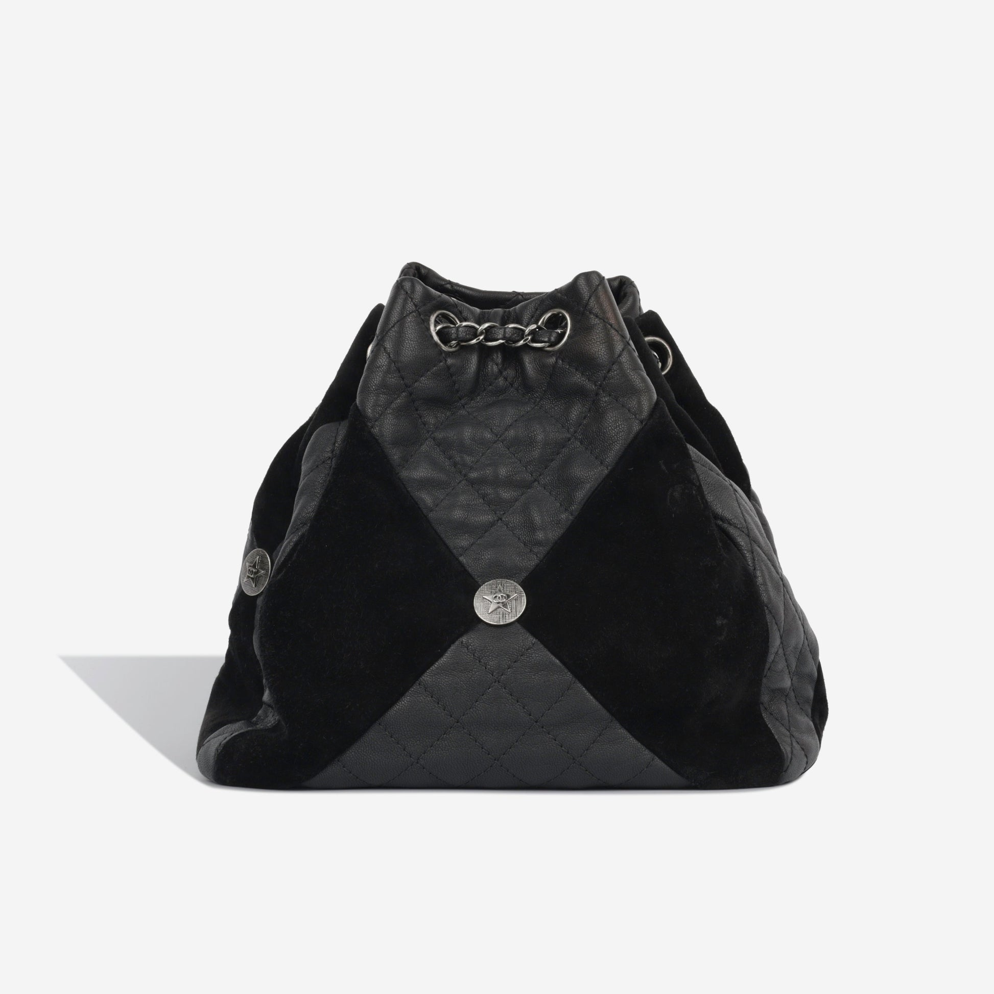 From their Cruise 2016 collection, Chanel presented the Patchwork Drawstring bag, carefully crafted in black quilted leather with suede accents. This bag is both functional and stylish - designed for a feminine woman with an edgy look and a love for modern pieces. The Patchwork Drawstring bag interior is lined with a zip pocket as well as one spacious compartment to carry all your necessities in style. Featuring tiny logo studs on front and rear of the bag - this particular piece exudes a contemporary, understated aesthetic and is perfect for every day use.