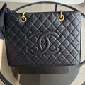 An absolute gem! The elusive Chanel GST Grand Shopping Tote in luxurious black caviar calfskin with opulent golden hardware. With Chanel discontinuing this classic design, it's a must-have for any true collector.