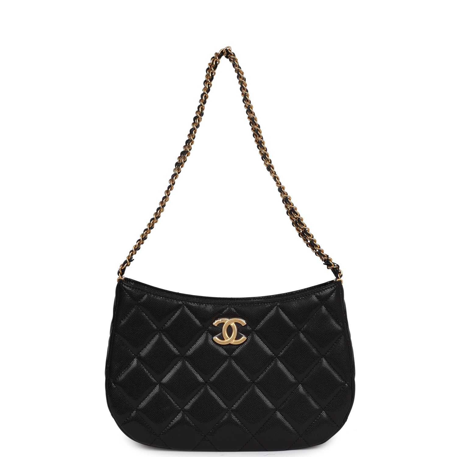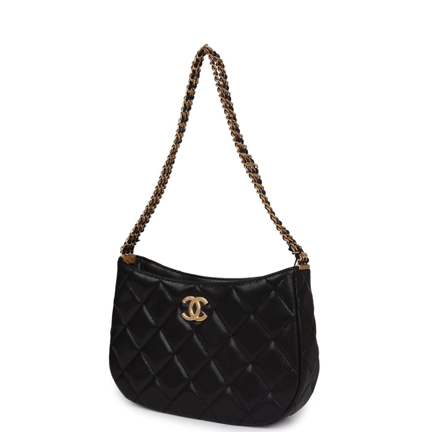 This Hobo is in black shiny caviar with brushed gold hardware and has tonal stitching, signature CC on front of bag, zip top closure and an interwoven brushed gold chain woven with black leather.