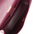 This Jumbo Classic Double Flap bag is in dark burgundy shiny grained calfskin leather with gold tone hardware and features a front flap with signature CC turnlock closure, half moon back pocket, and adjustable interwoven gold tone chainlink and dark burgundy leather shoulder strap.
