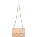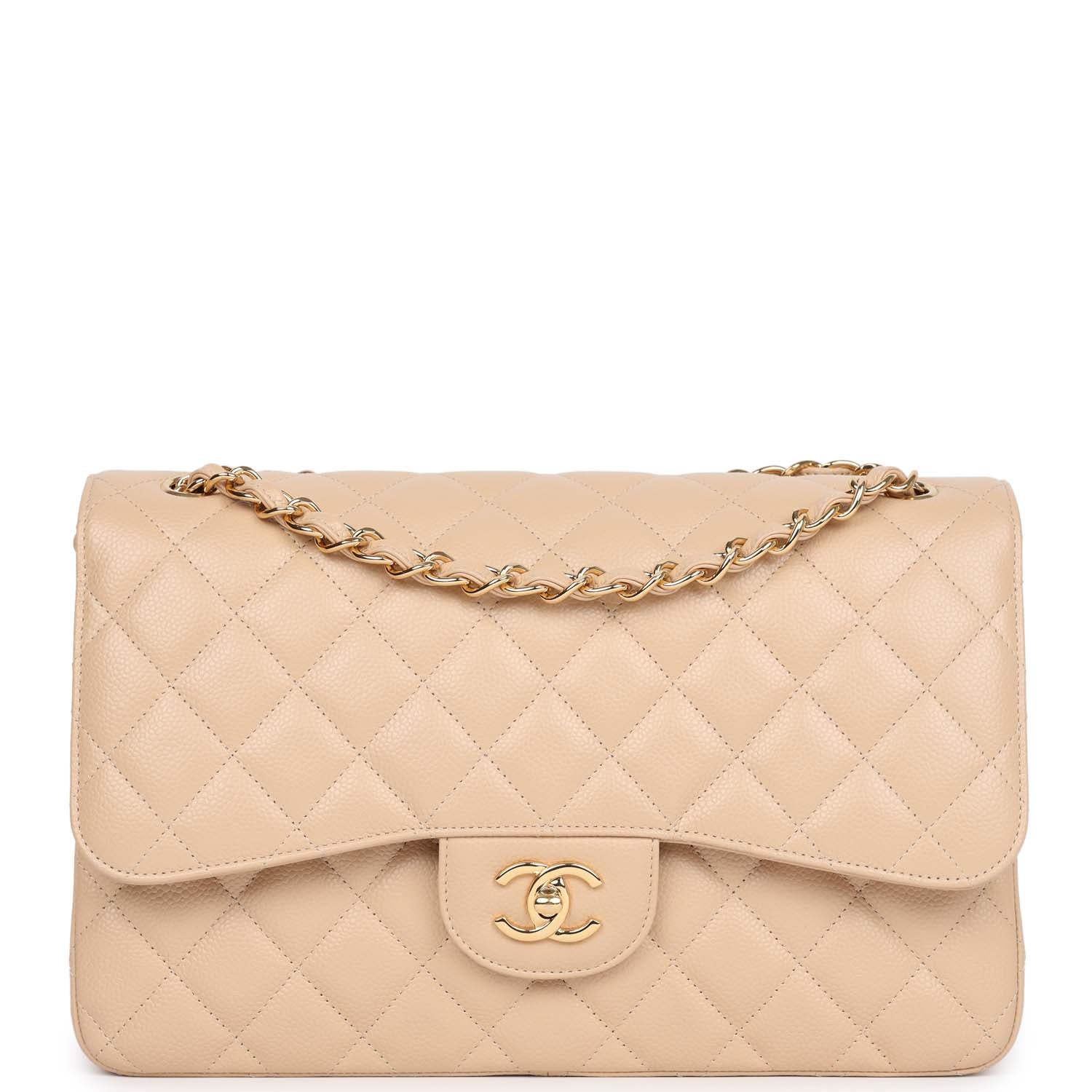 Jumbo Classic Double Flap bag is in light beige caviar leather with gold tone hardware and features a front flap with signature CC turnlock closure, half moon back pocket, and adjustable interwoven gold tone chain link and light beige leather shoulder strap.