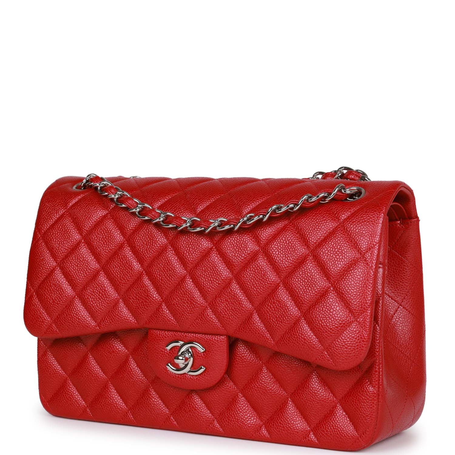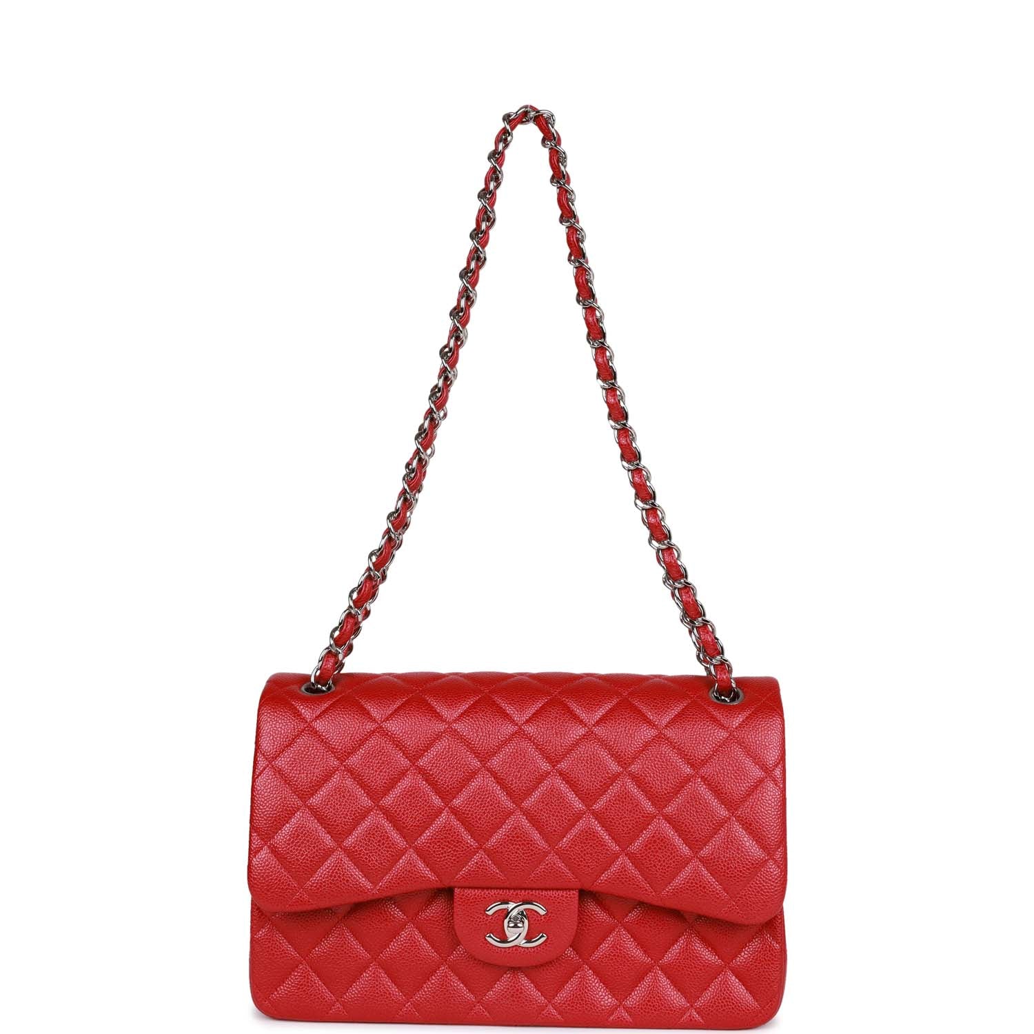 This Jumbo Classic Double Flap bag is in Red quilted caviar leather with silver tone hardware, front flap with CC turnlock closure, half moon back pocket and adjustable interwoven silver tone chain link and red leather shoulder/crossbody strap.