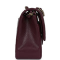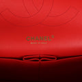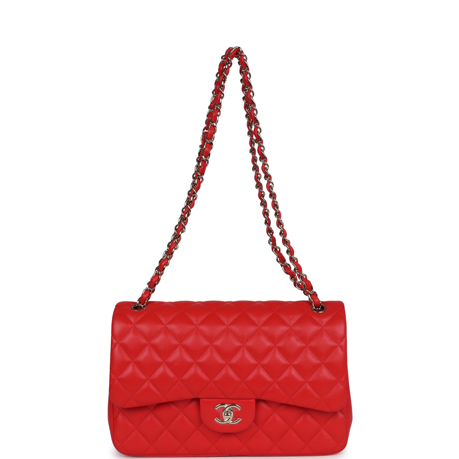 This Jumbo Classic Double Flap bag is in red lambskin leather with light gold tone hardware and features a front flap with signature CC turnlock closure, half moon back pocket, and adjustable interwoven light gold tone chain link and red leather shoulder strap.