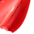 The interior is lined in red leather with a "love letter" zipper compartment under the first flap, an "outer" slit pocket under the second flap, and an interior compartment with two open pockets separated by a "lipstick" compartment.