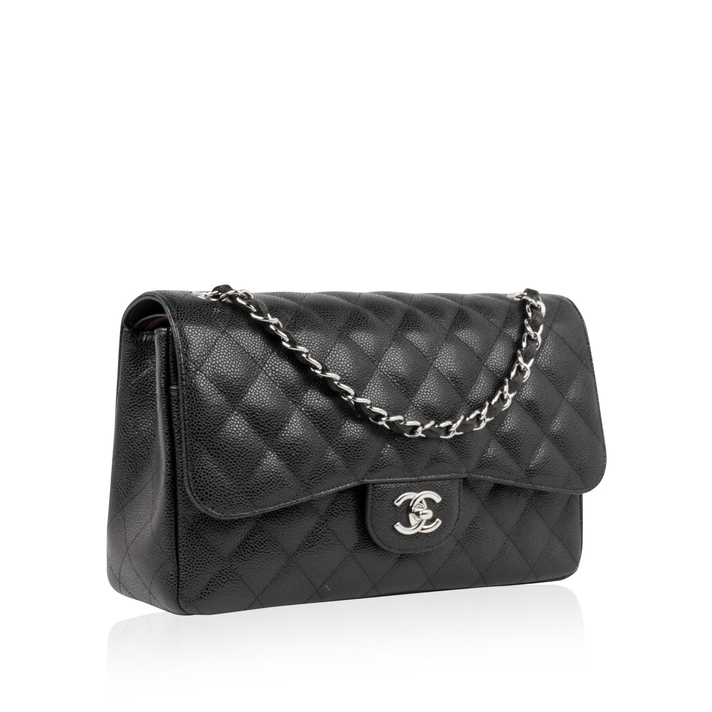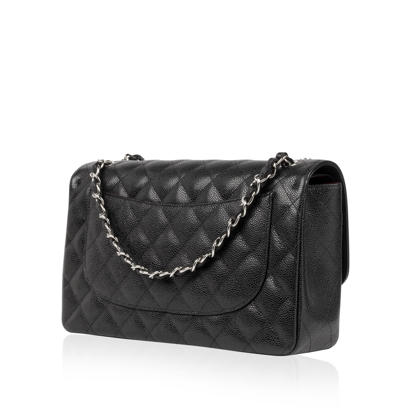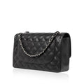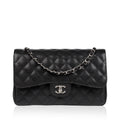 Chanel continues to present its signature line of Classic Flap bags. Under the creative direction of Karl Lagerfeld, the Classic Flap is perhaps the most acclaimed bag in all of fashion history. Timeless, elegant and sophisticated, it's no wonder the Classic Flap is, well, a classic. Featuring its infamous quilted caviar leather and interwoven chain / leather strap, the Jumbo is an absolute must-have in any luxury handbag collection. Not only is this highly coveted, stunning black bag the perfect compliment to pretty much anything you have in your wardrobe, but it's also an investment piece that will never lose its value. Embodying elegance and traditional femininity to a T, a Chanel bag is a purchase you won't ever regret.