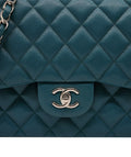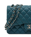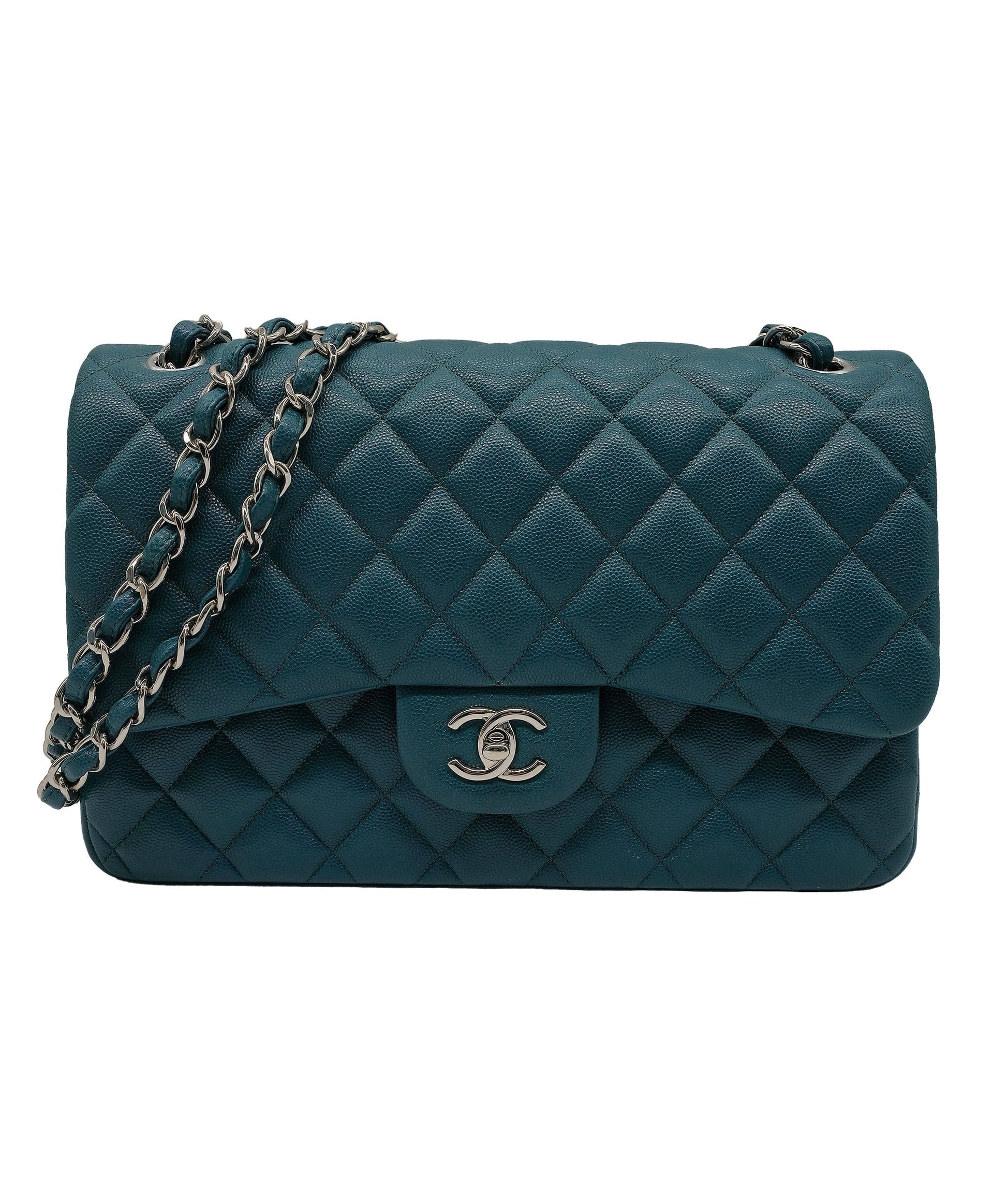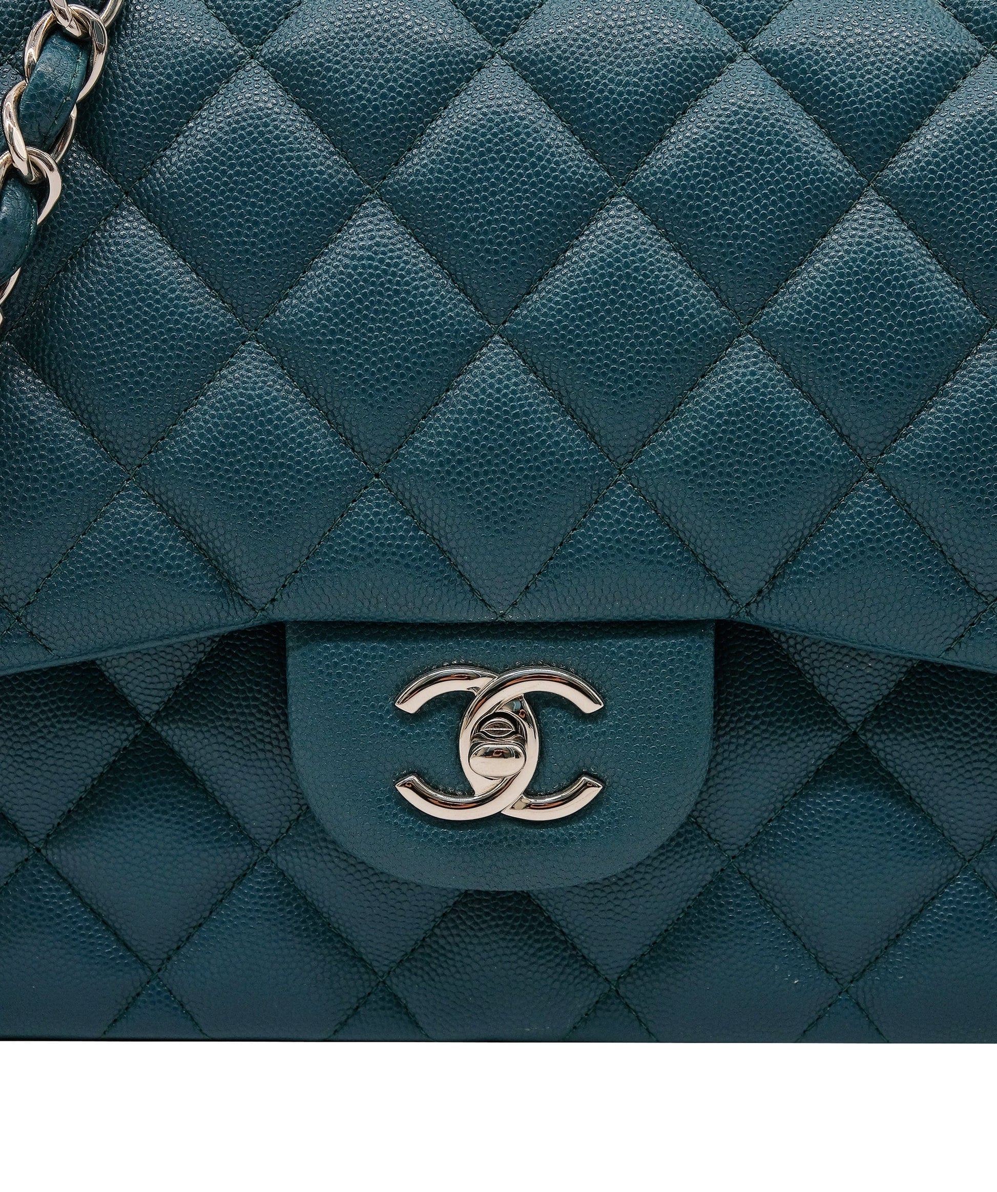Shop this stunning Chanel Jumbo Green Double Classic Flap Shoulder Bag at Luxury Promise today! Crafted from caviar leather in teal green and finished with silver hardware. The ultimate classic to add to your collection. Overall in pristine condition, comes with dust bag and . RRP around £10,000!
