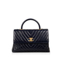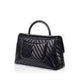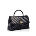 Crafted from meticulously aged calfskin in a quilted chevron style, Chanel presents the beloved Large Coco Handle Flap in an exquisite dark blue. The handbag is adorned with gold toned hardware and the fashion house’s quintessential interlocking CC closure. The shoulder bag features a sturdy rolled top handle and a detachable shoulder strap, making this magnificent handbag great for both meetings and dinners, dresses and trousers. The flap opens up to a well partitioned fabric interior with ample space for your necessities, from slip pockets to zip pockets; there is very little this handbag lacks.