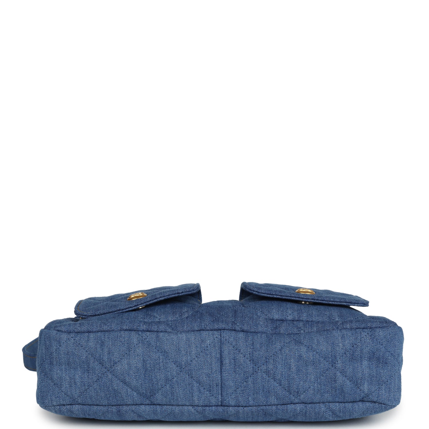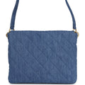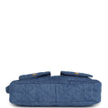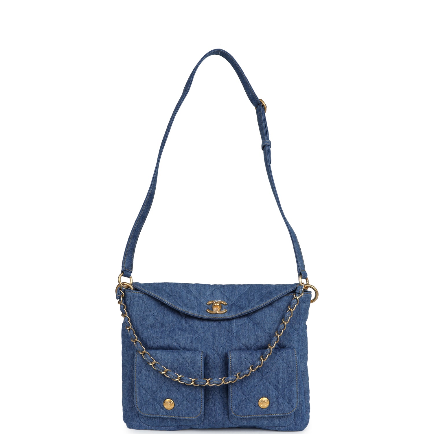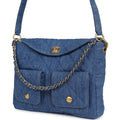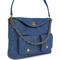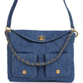 This Chanel Large "Supple Twins" Hobo Bag is in blue denim fabric with brushed gold hardware featuring signature diamond quilt, two front pockets, a fold over flap with CC turnlock closure, an adjustable flat denim shoulder/crossbody strap and a single interwoven brushed gold and denim top handle.
