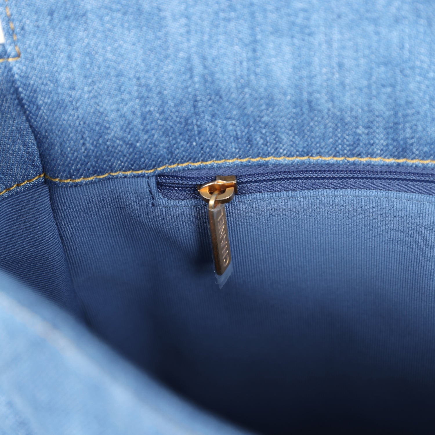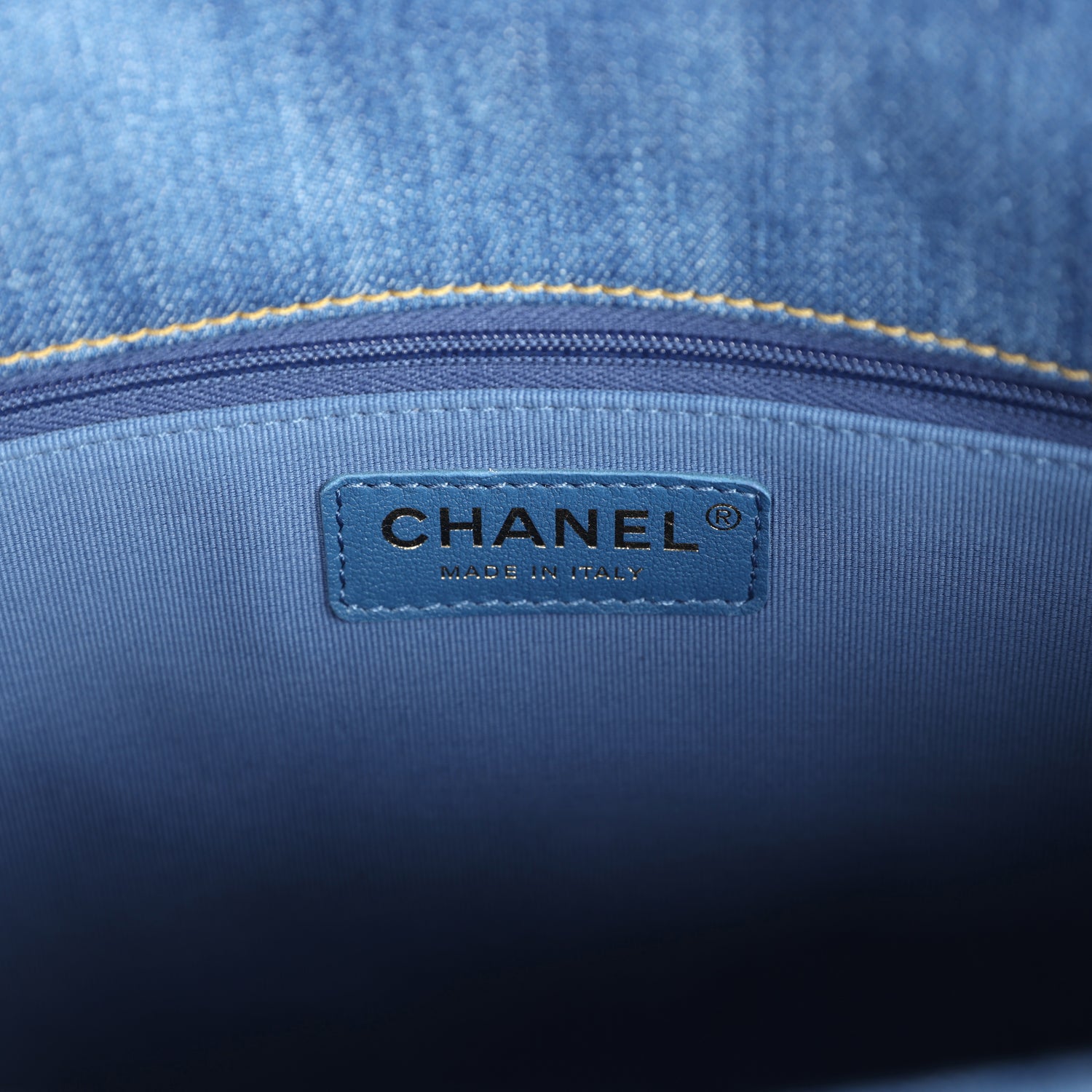 The interior is lined in blue grossgrain fabric and has one zip pocket on the rear wall with logo pull.