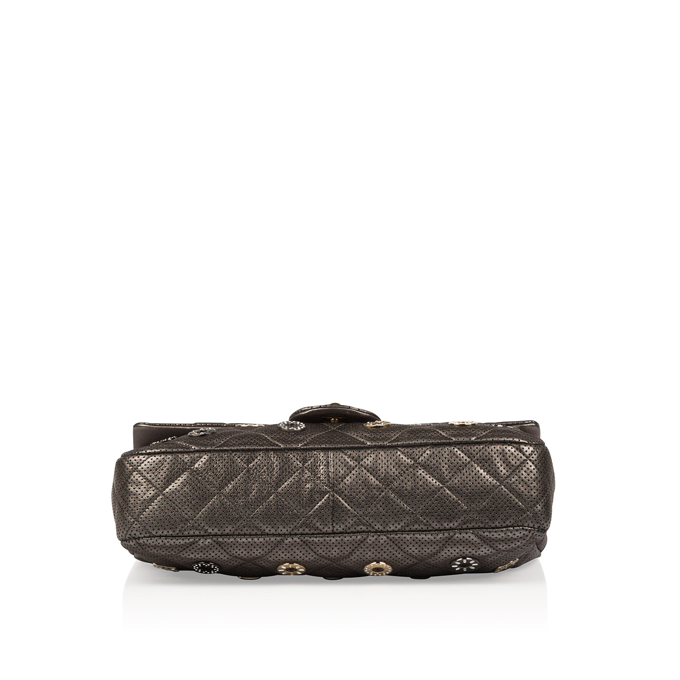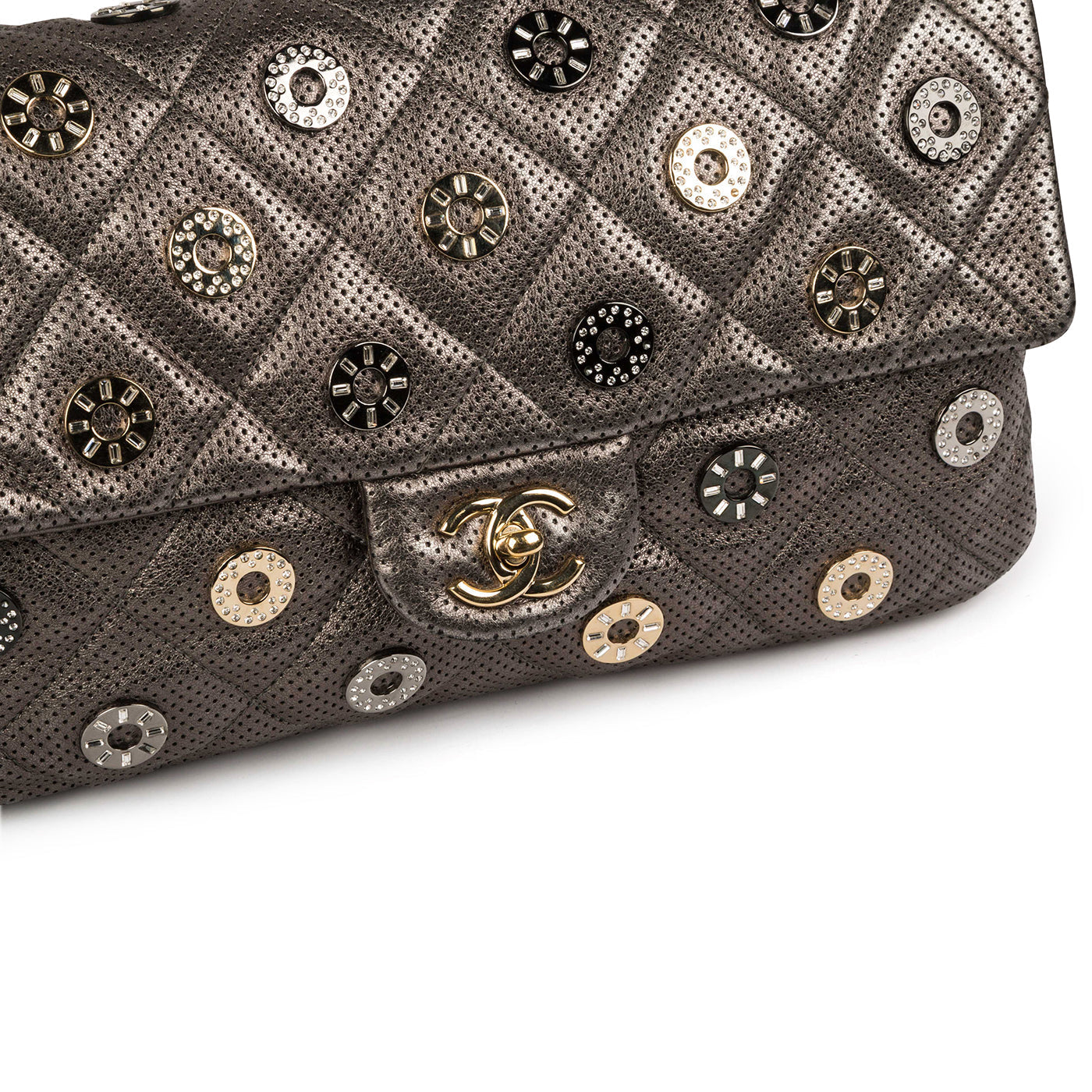 Be dazzled by the extremely rare and alluring Chanel Eyelet Perforated Flap Bag in fantastic grey. Crafted from perforated lambskin leather and punctuated with gorgeous black and silver eyelet detail, this magnificent handbag from our favourite fashion house is a limited edition piece. The bag’s eyelet detail is further embellished with circular and longitudinal crystals, which radiate an unarguable eloquence. Its flap design opens to reveal a matching grey textile interior and showcases a single storage compartment alongside a spacious zip compartment. Sophisticated and quite honestly jaw-dropping, Chanel’s Eyelet Perforated Flap Bag was made to be showed off when the night falls.