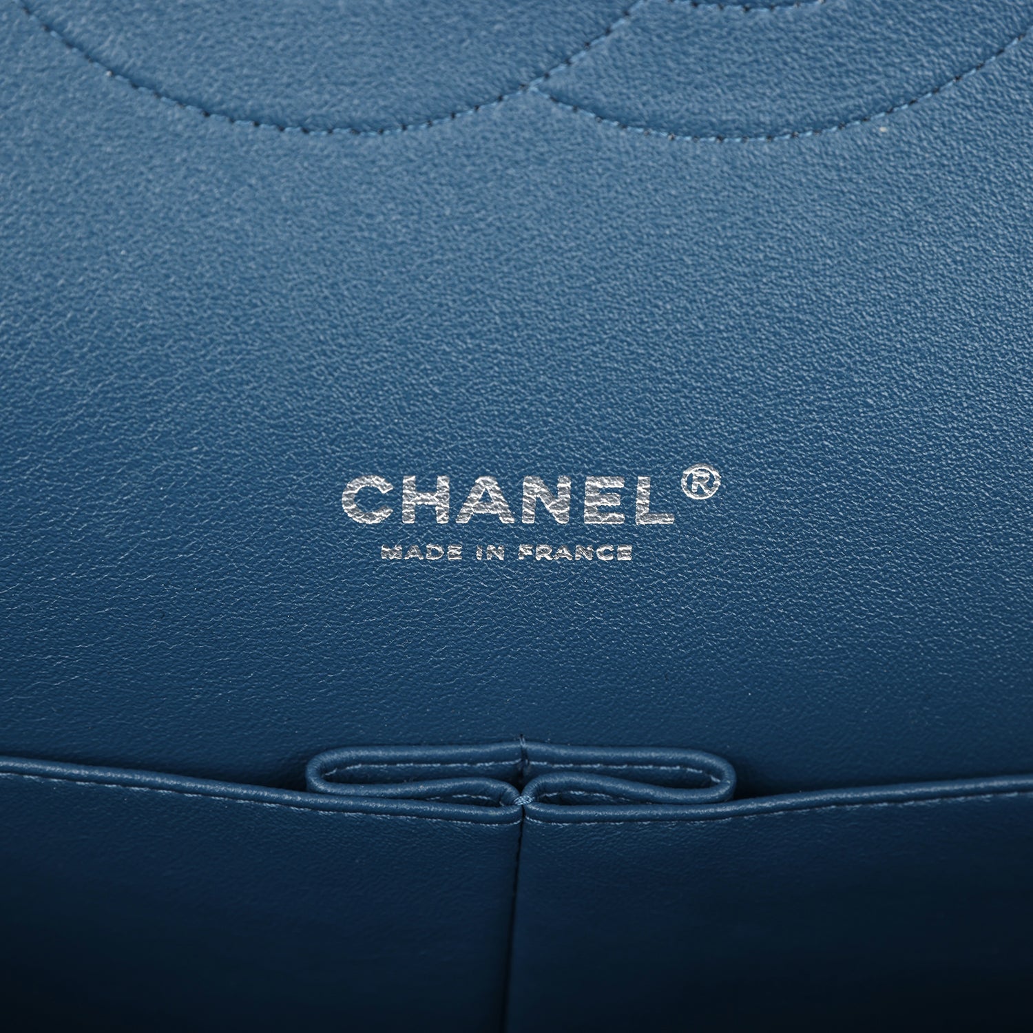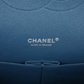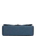 This Maxi Classic Double Flap bag is in dark blue caviar leather with silver hardware and features a front flap with signature CC turnlock closure, half moon back pocket, and adjustable interwoven silver tone chain link and dark blue leather shoulder strap.