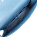 The interior is lined in dark blue leather with a "love letter" zipper compartment under the first flap, an "outer" slit pocket under the second flap, and an interior compartment with two open pockets separated by a "lipstick" compartment.