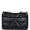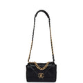 This Medium 19 Flap bag is of black lambskin leather with mixed metal hardware and has the signature diamond quilting, signature 19 style CC interlocking closure, exterior back pocket, chain top handle, and long shoulder strap is made of brushed gold, ruthenium, and silver tone and black leather chain.