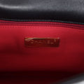 The interior is lined in red grossgrain fabric and has one zippered pocket on back wall with brushed gold zipper pull.