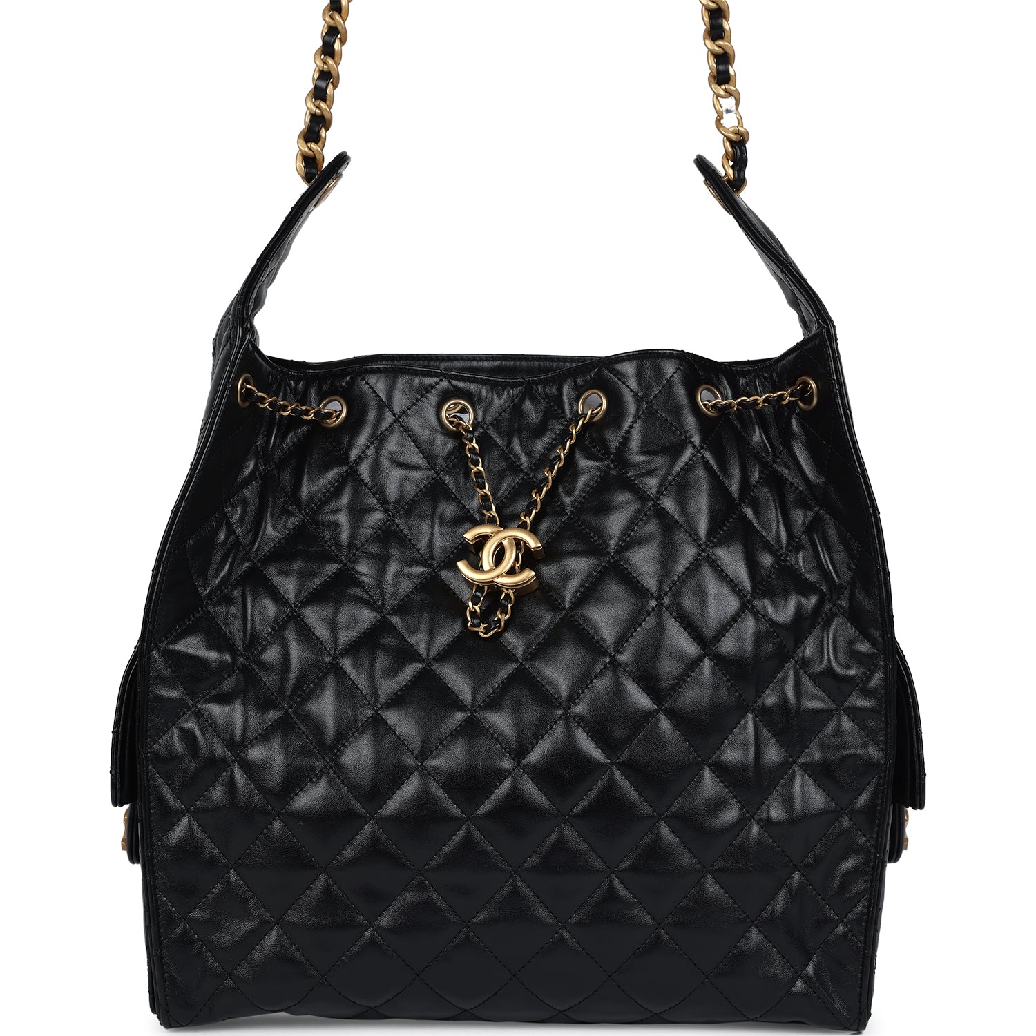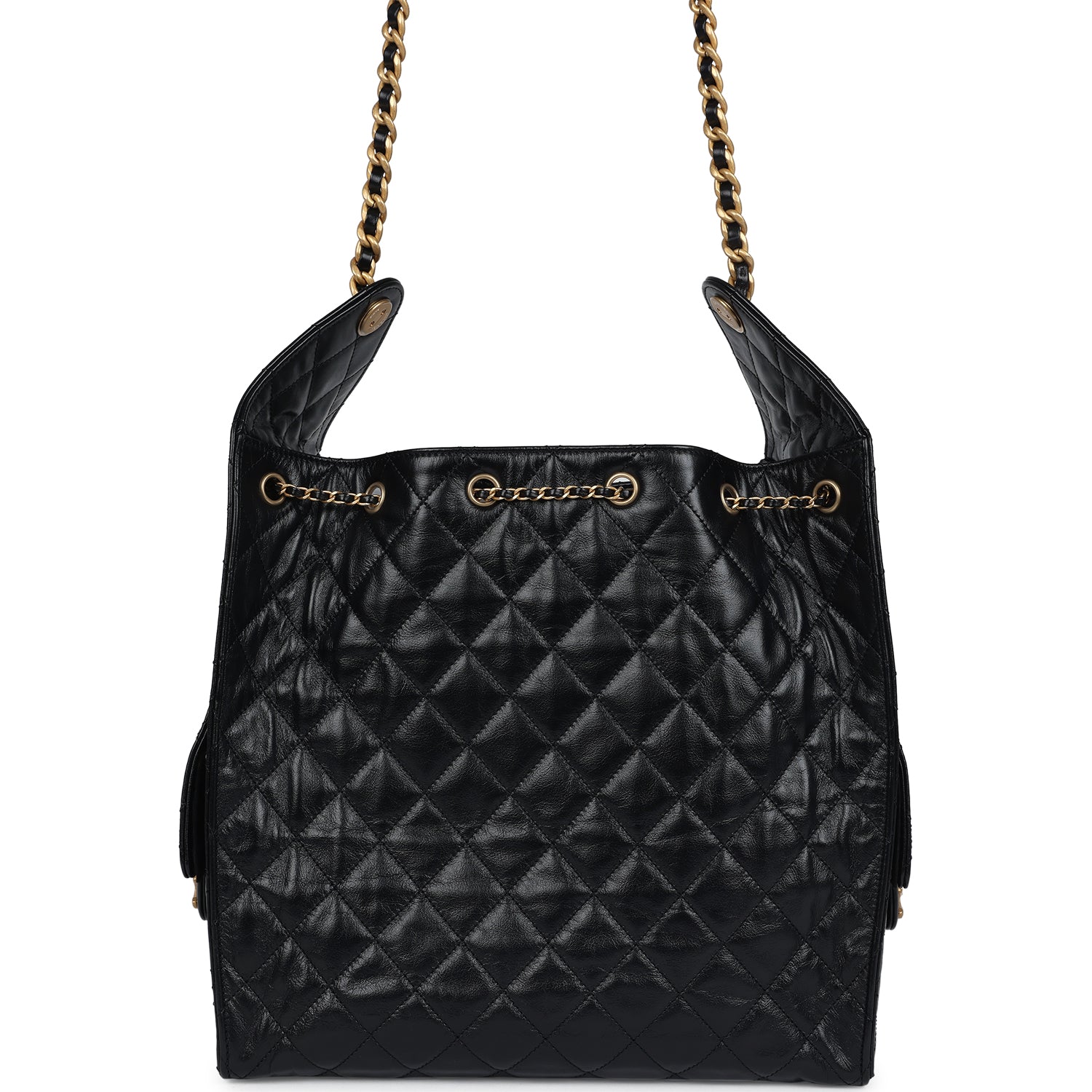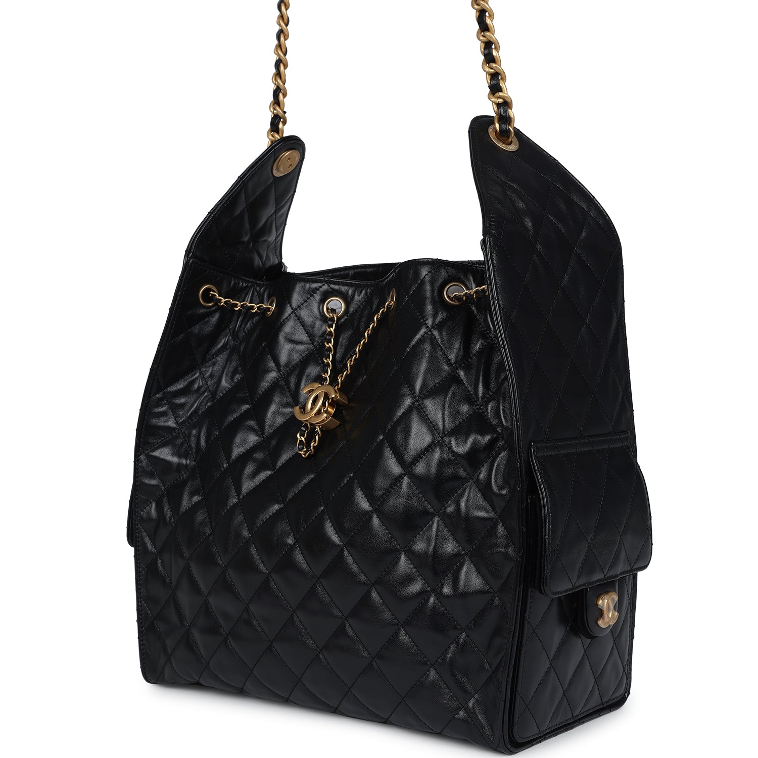 Chanel Medium 25 Hobo Bag Black Shiny Lambskin Antique Gold Hardware