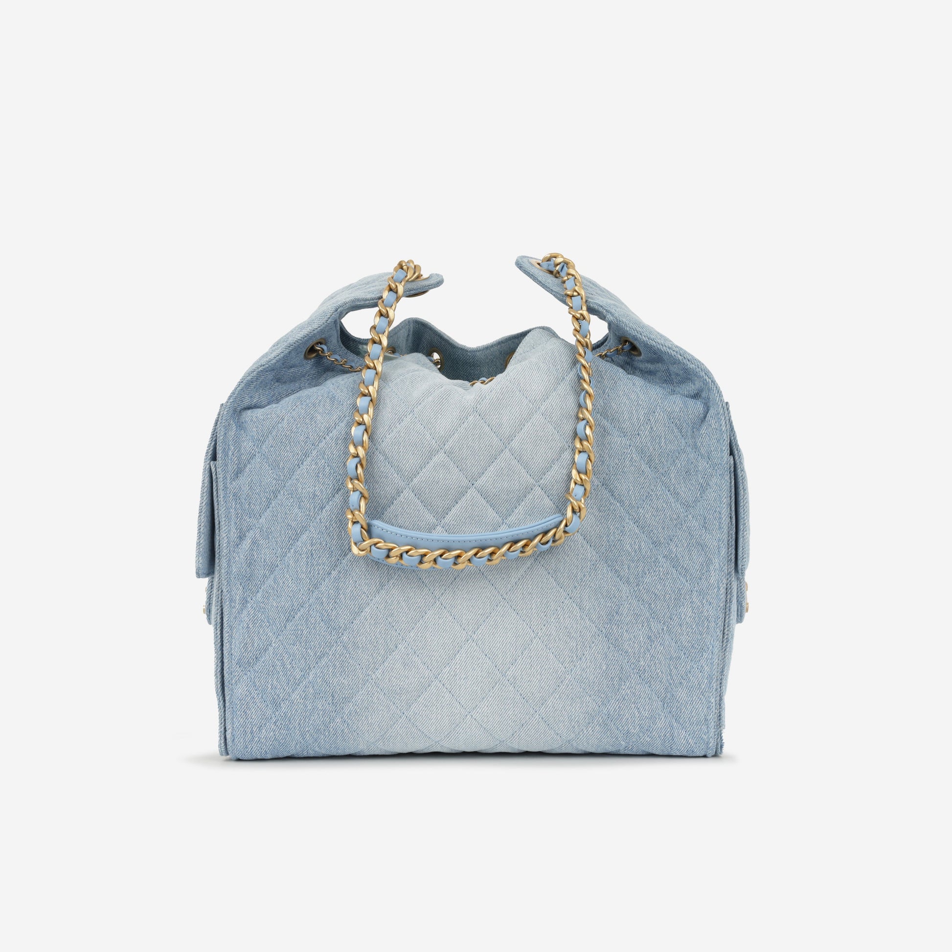 The Chanel 25 Medium Handbag blends timeless sophistication with everyday functionality. Drawing inspiration from the Chanel 22, it features a relaxed, slouchy structure and a refined trapezoid silhouette. Crafted in washed denim with signature CC emblems and a bold chain strap, it brings a vintage flair to a modern design. This medium-sized version offers a spacious main compartment and handy side pockets with CC clasps, while the drawstring closure accentuates its bucket-style shape, ensuring both easy access and security.