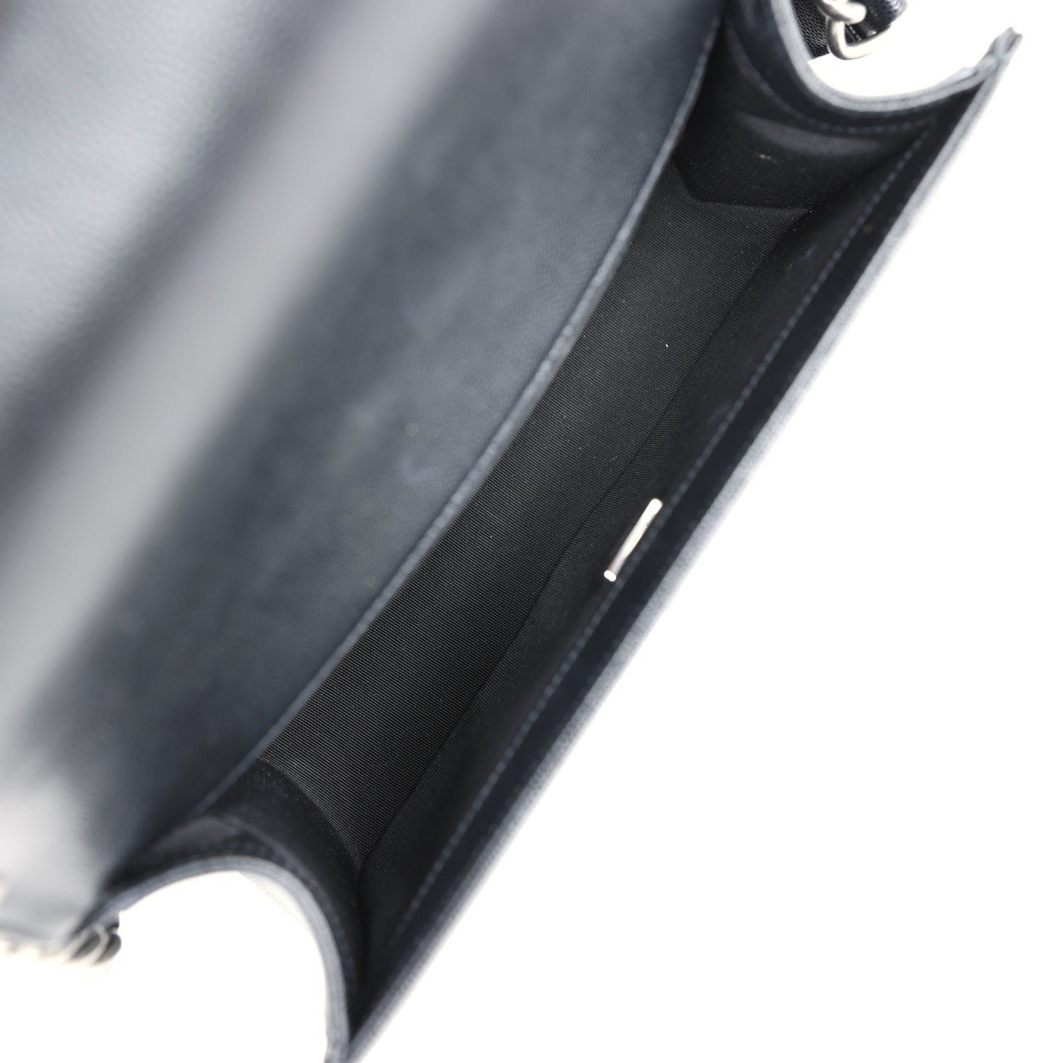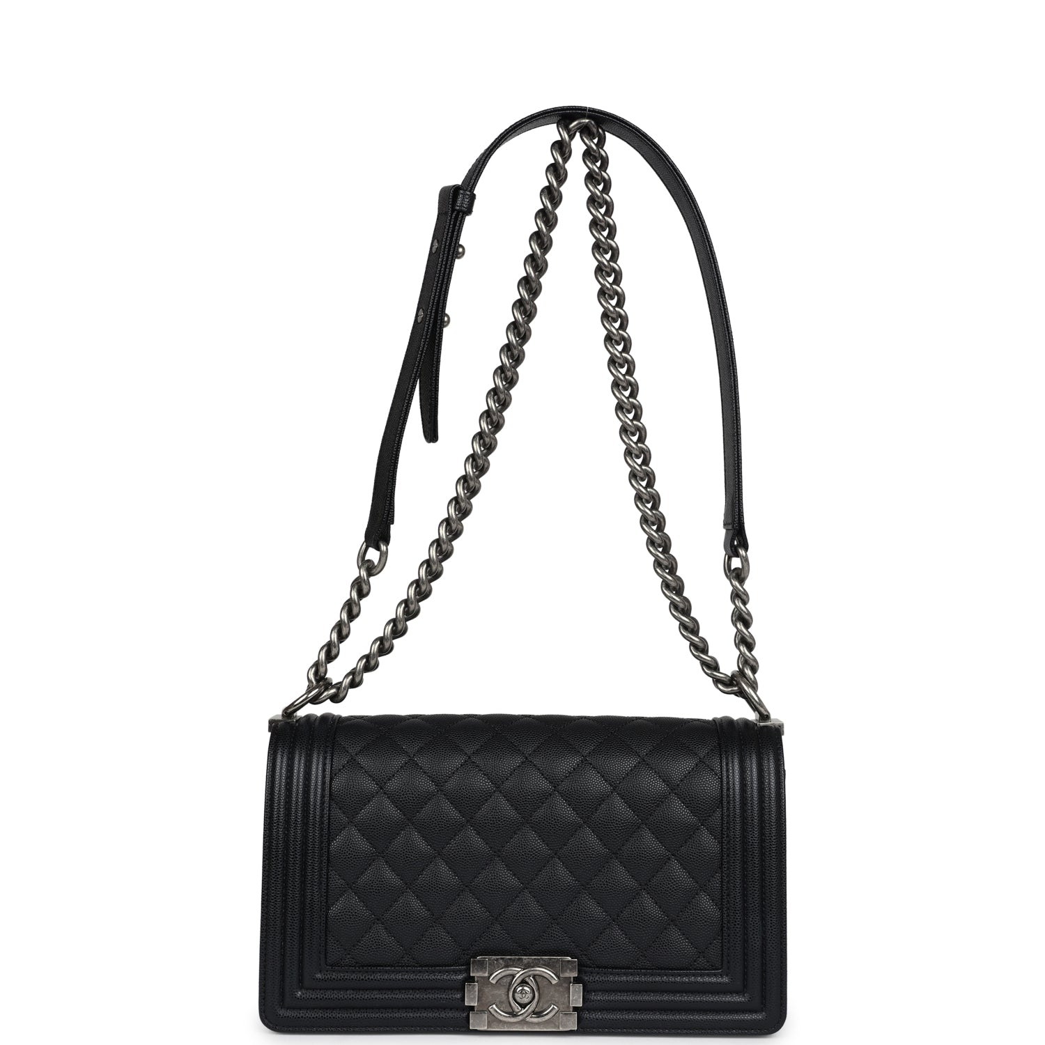 This Medium Boy Bag is in black caviar leather with aged ruthenium hardware and features a full front flap with the Le Boy CC push lock closure and an aged ruthenium chain link and black leather padded shoulder/crossbody strap.