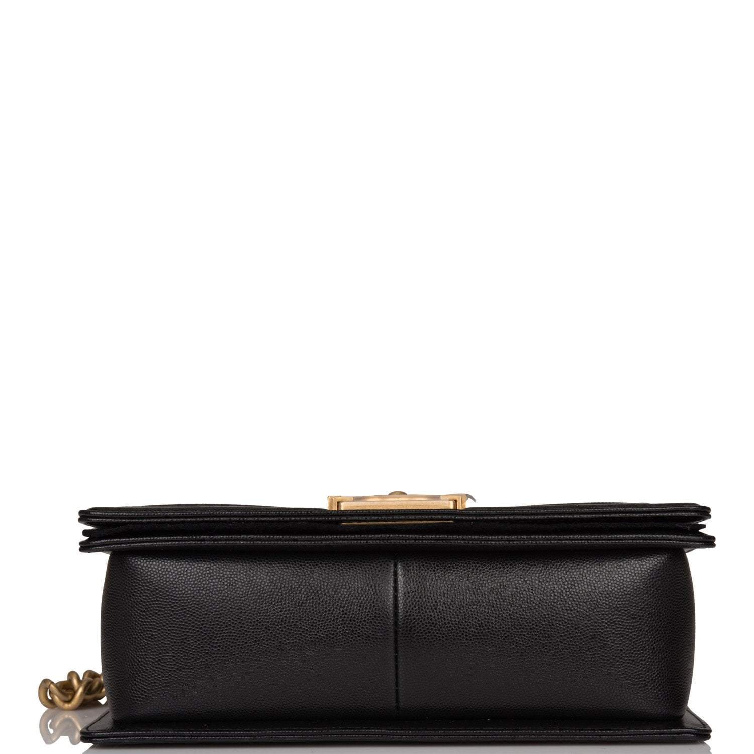 This Old Medium Boy bag is in black chevron caviar leather with antique gold tone hardware and features a full front flap with the Le Boy CC push lock closure and an antique gold tone chain link and black leather padded shoulder/crossbody strap.