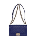 This Old Medium Boy Bag is in Blue Caviar with light gold hardware, tonal stitching, front flap with Le Boy CC push closure and an interwoven chain link and leather shoulder strap.