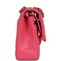 This Medium Classic Double Flap bag is in hot pink shiny caviar leather with light gold tone hardware and features a front flap with signature CC turnlock closure, half moon back pocket, and adjustable interwoven light gold tone chain link and hot pink leather shoulder strap.