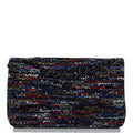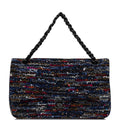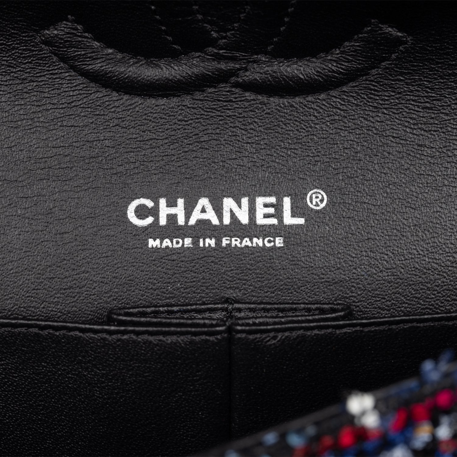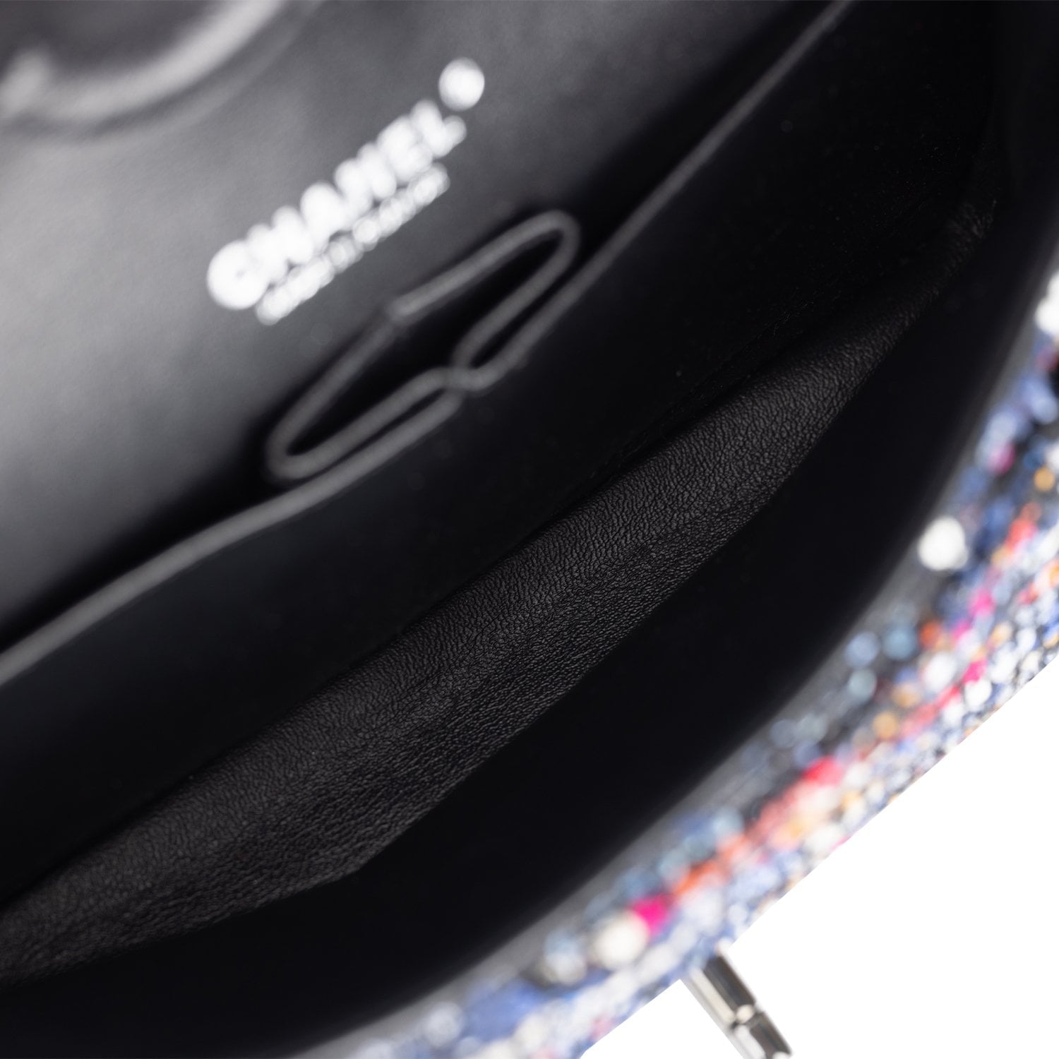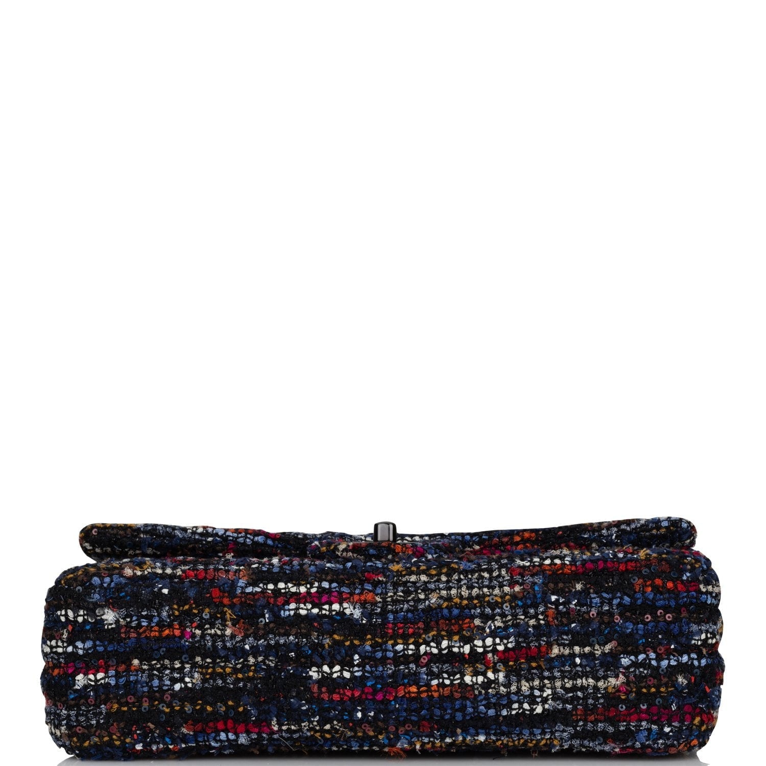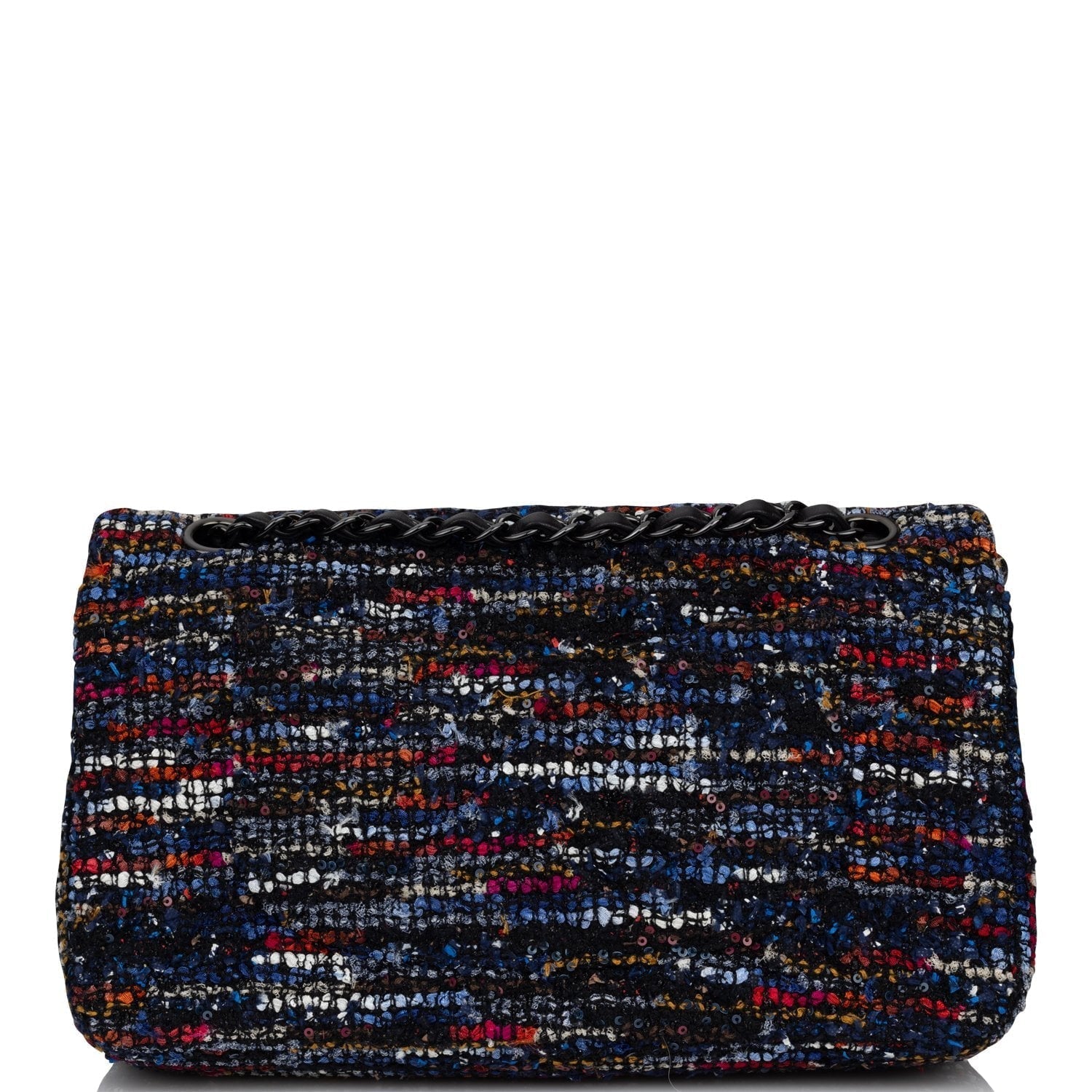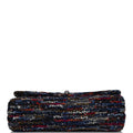 Medium Classic Double Flap bag is in multicolor tweed with black hardware and features a front flap with signature CC turnlock closure, half moon back pocket, and adjustable interwoven black chain link and black leather shoulder strap.