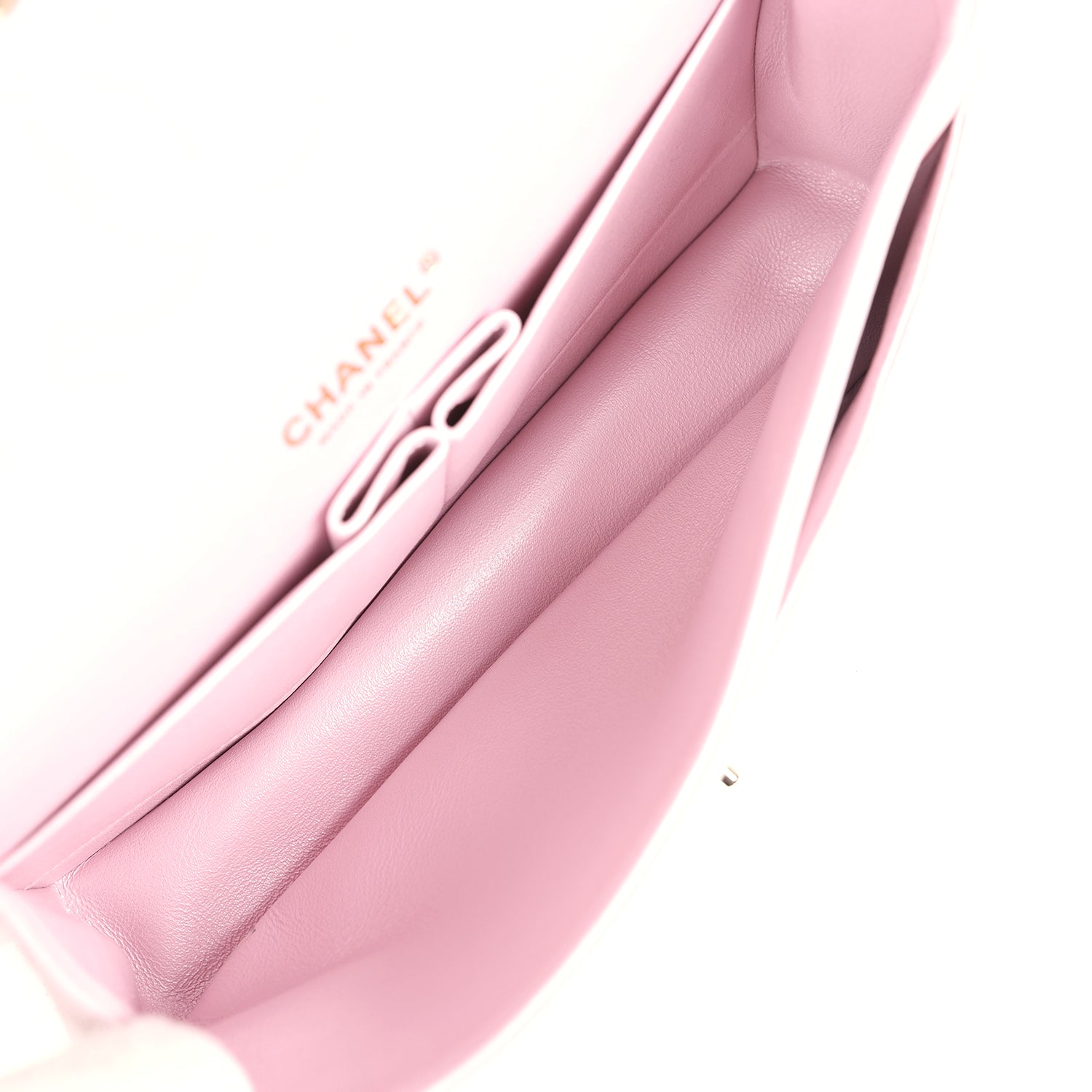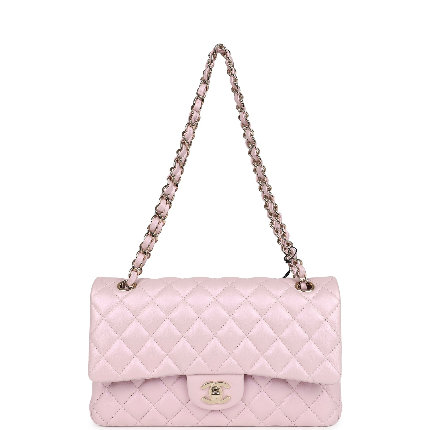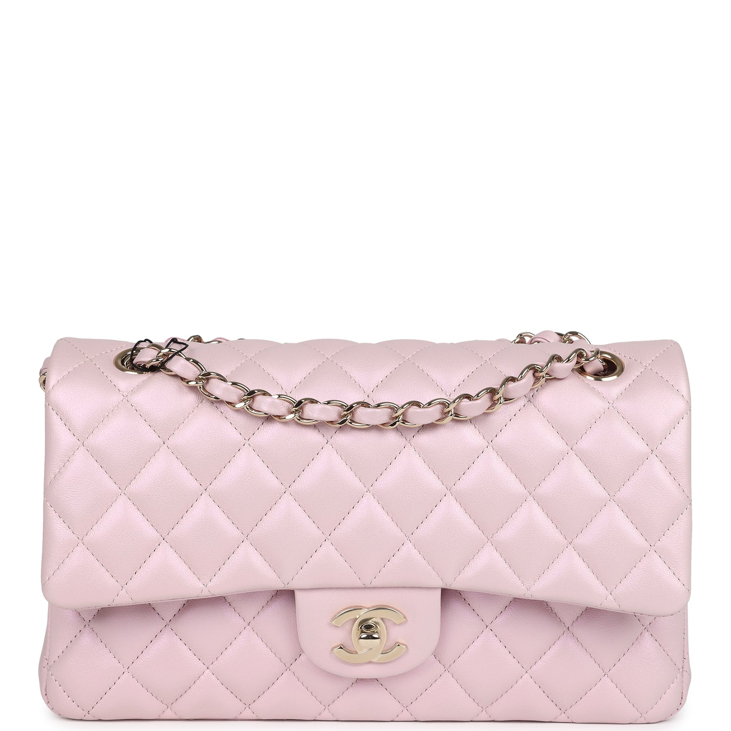 This Medium Classic Double Flap bag is in pink iridescent lambskin leather with light gold tone hardware and features a front flap with signature CC turnlock closure, half moon back pocket, and adjustable interwoven light gold tone chain link and pink leather shoulder strap.