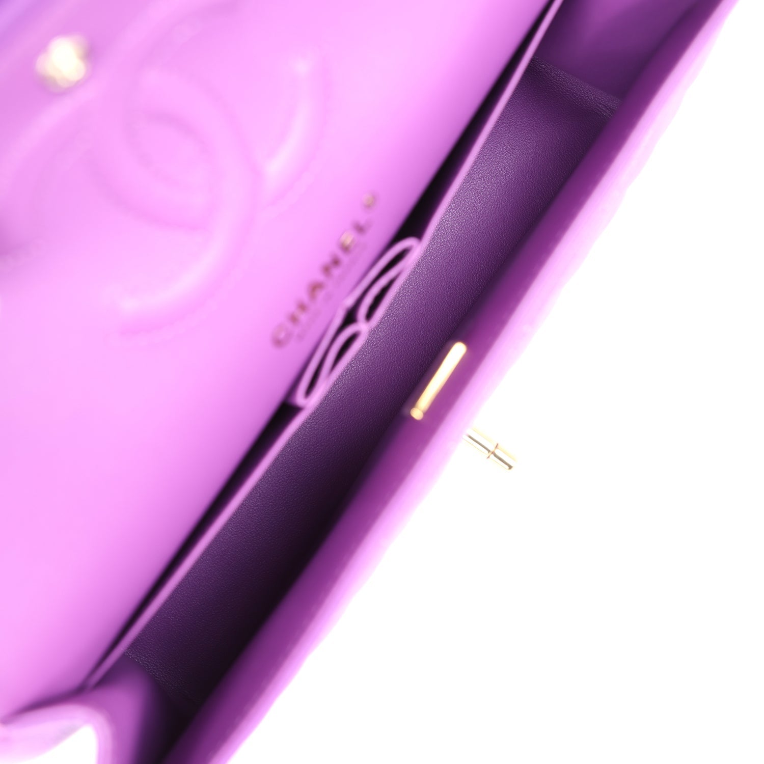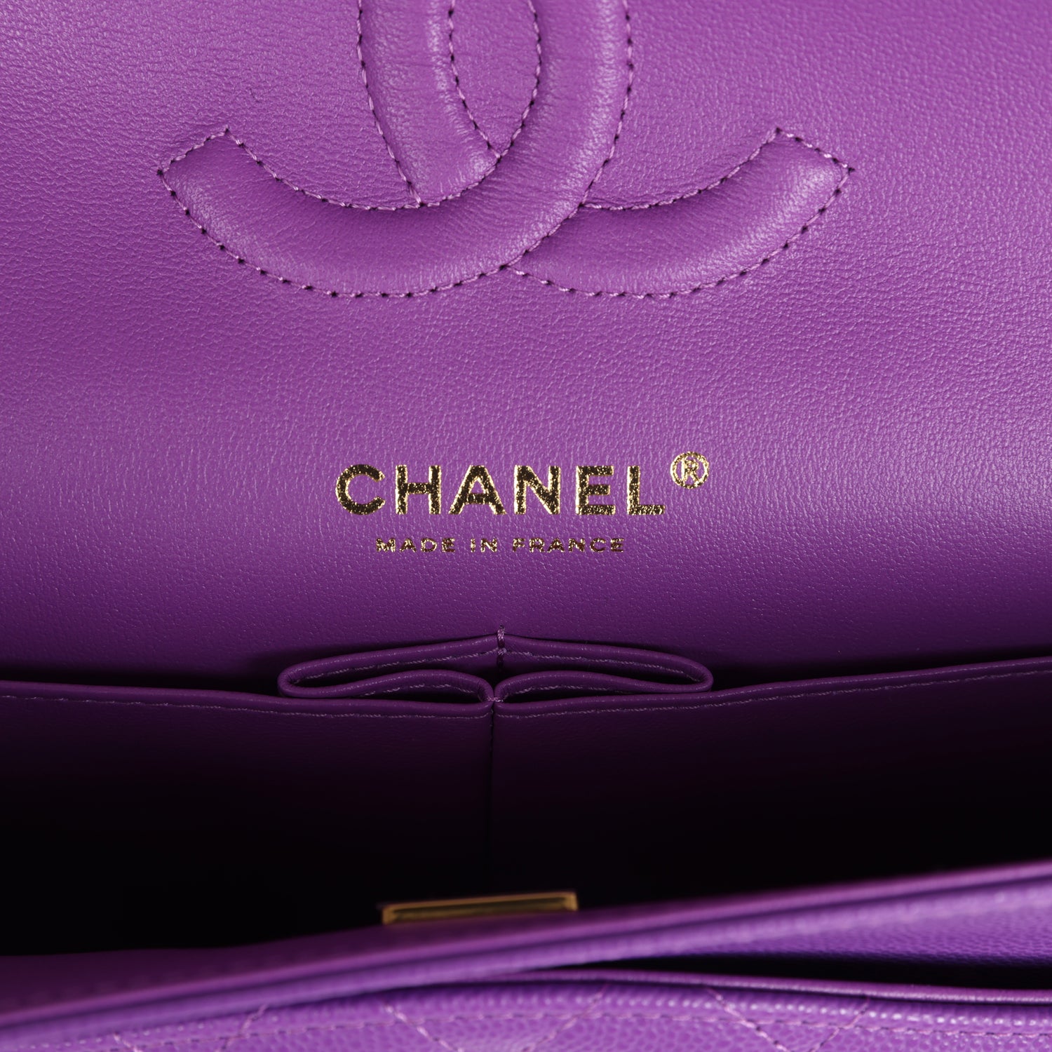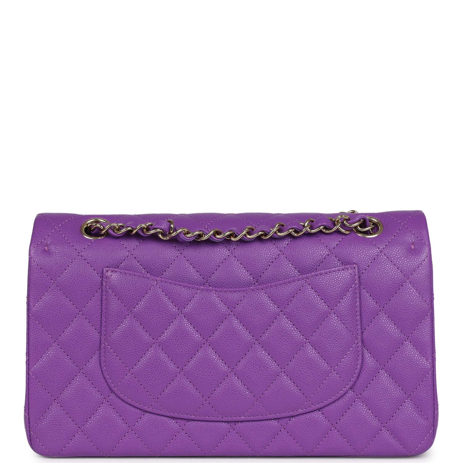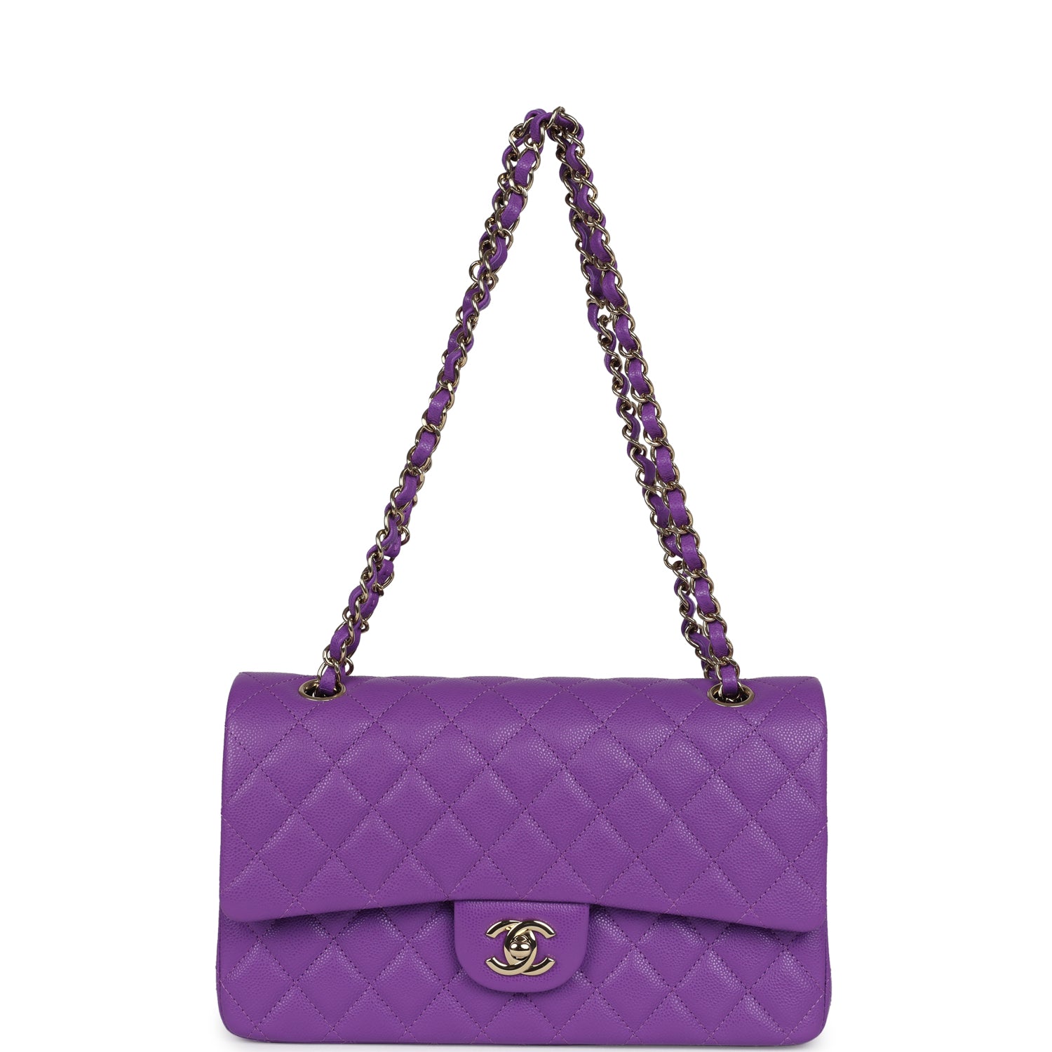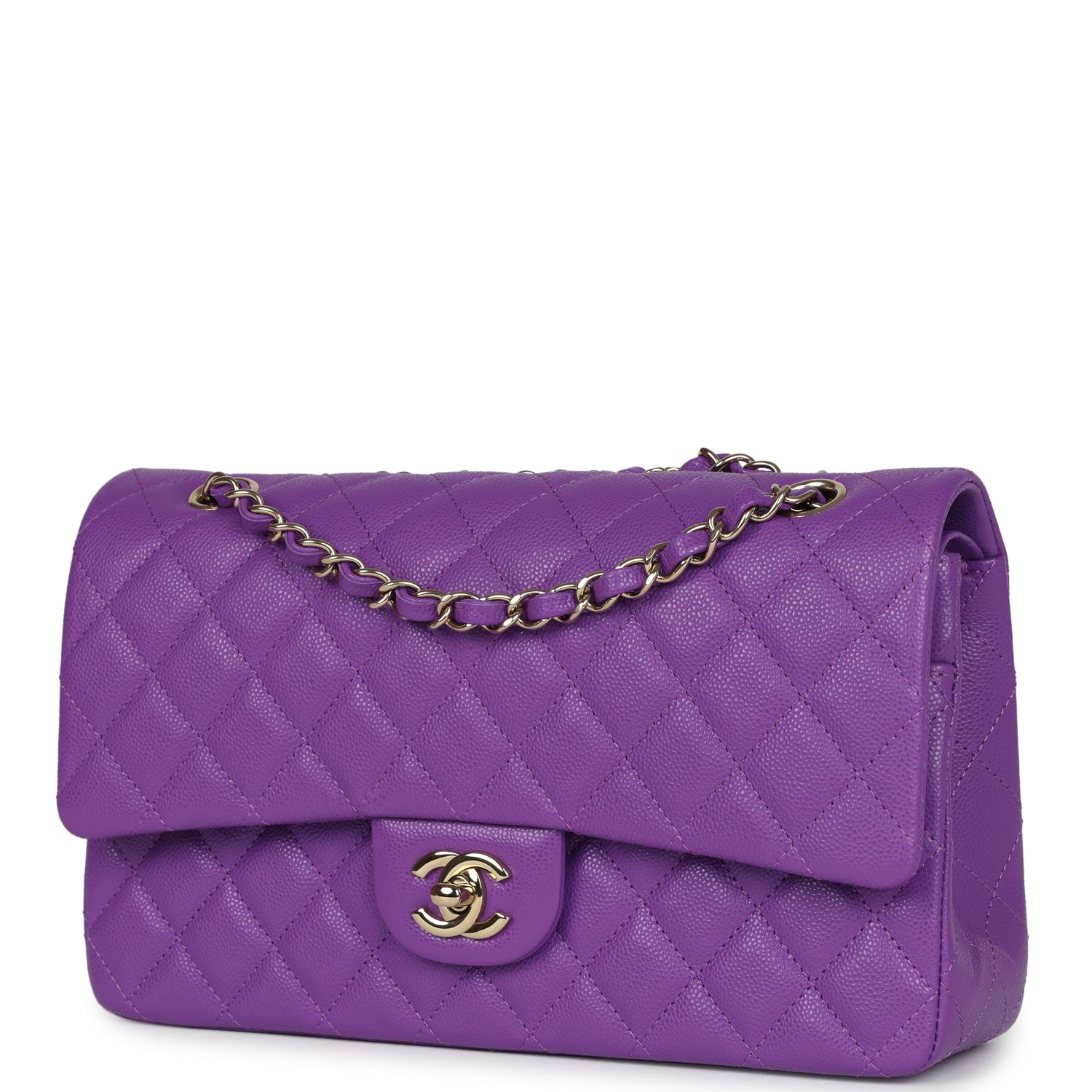 This Medium Classic Double Flap bag is in purple caviar leather with light gold tone hardware and features a front flap with signature CC turnlock closure, half moon back pocket, and adjustable interwoven light gold tone chain link and Purple leather shoulder strap.