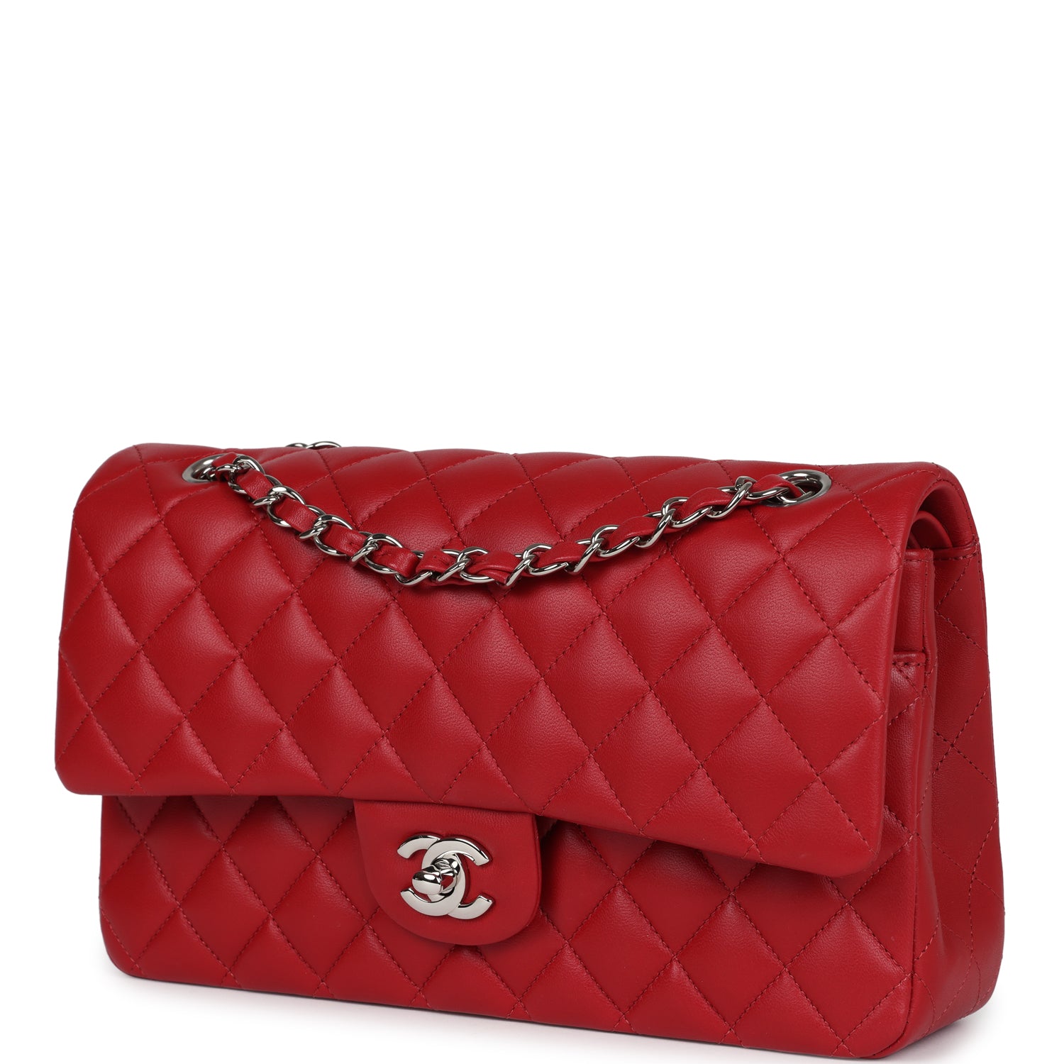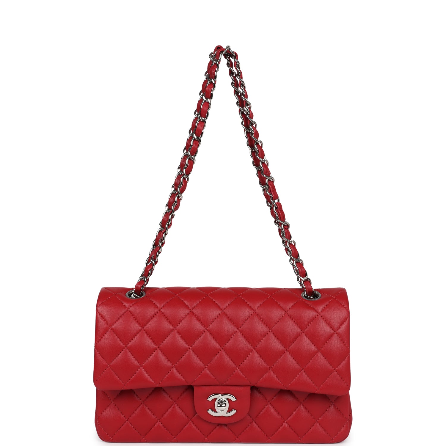 This Medium Classic Double Flap bag is in red lambskin leather with silver tone hardware and features a front flap with signature CC turnlock closure, half moon back pocket, and adjustable interwoven silver tone chain link and red leather shoulder strap.