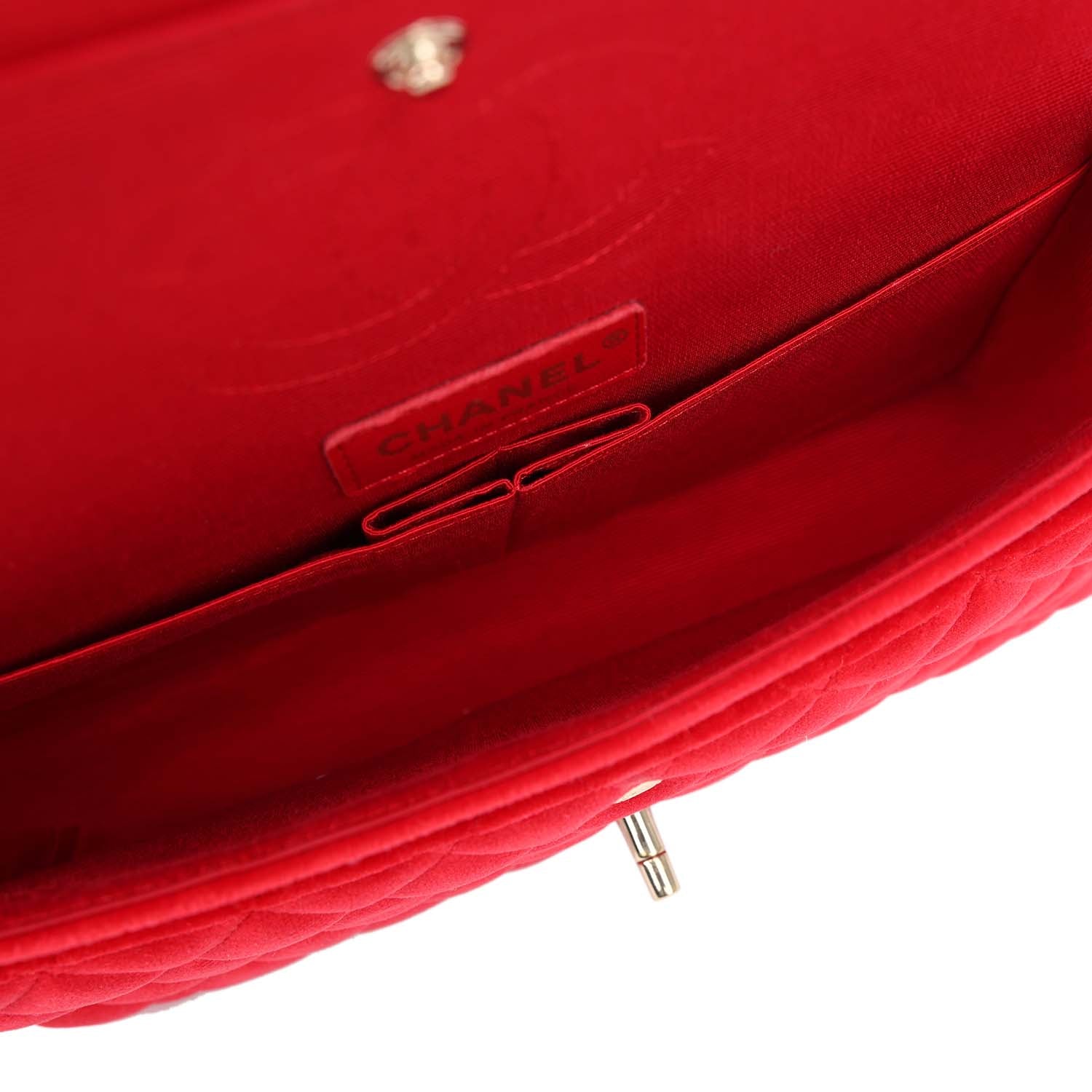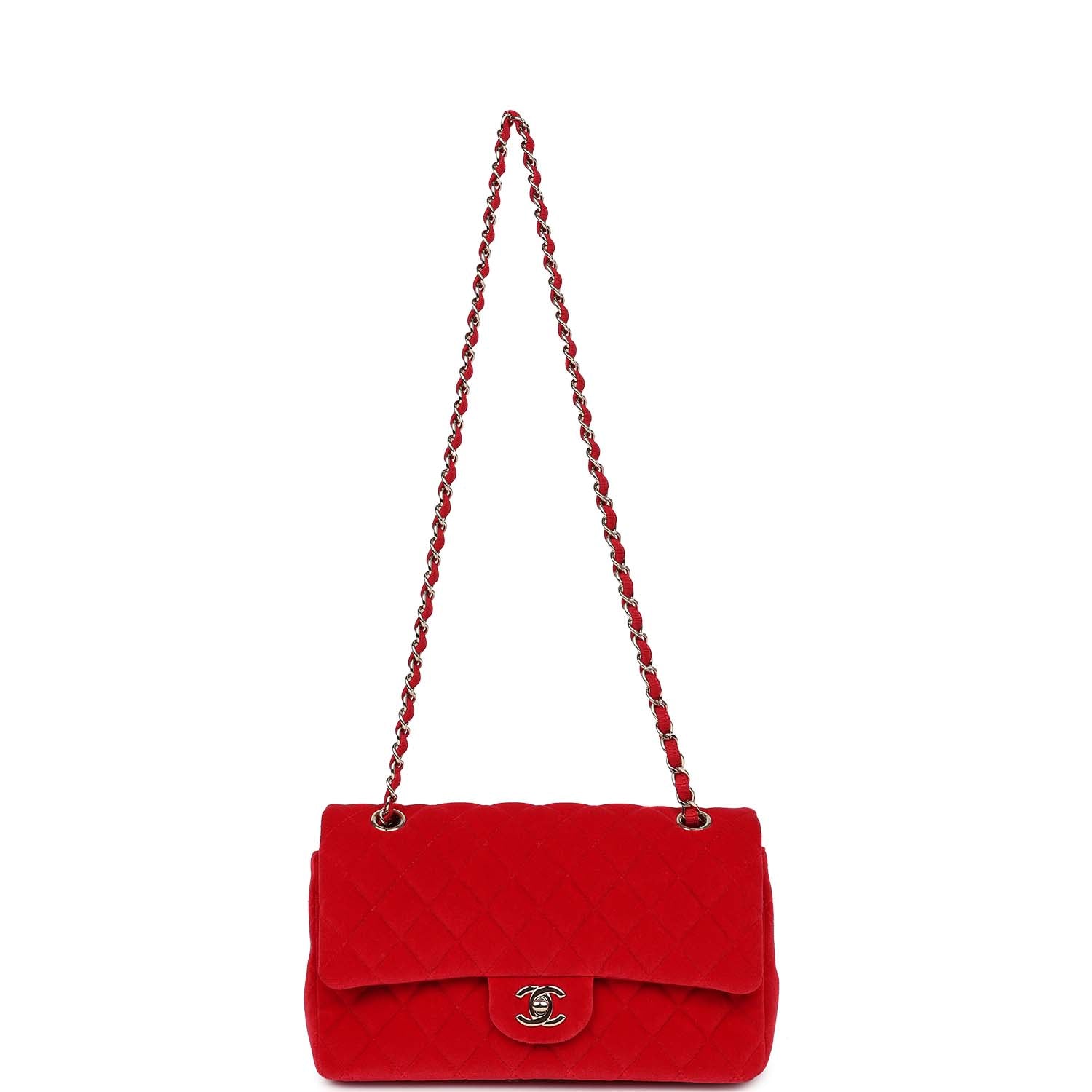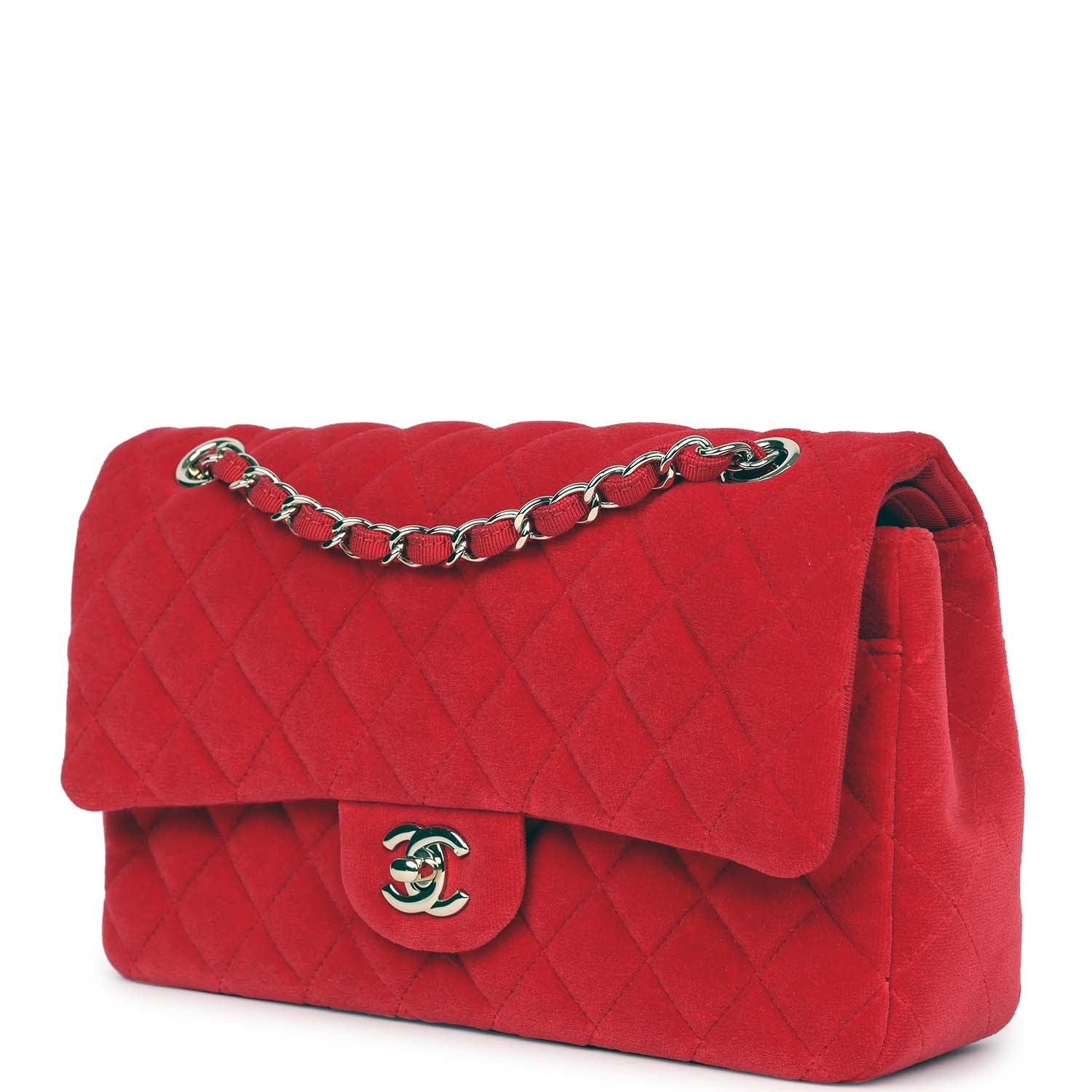 This Medium Classic Double Flap Bag is in red velvet fabric with light gold tone hardware featuring, signature diamond quilt, front flap with CC turnlock closure, half moon back pocket and an adjustable interwoven light gold tone chainlink and Red grossgrain shoulder/crossbody strap.