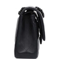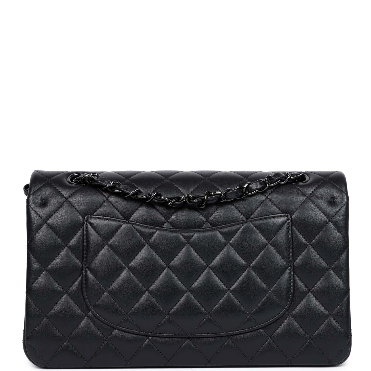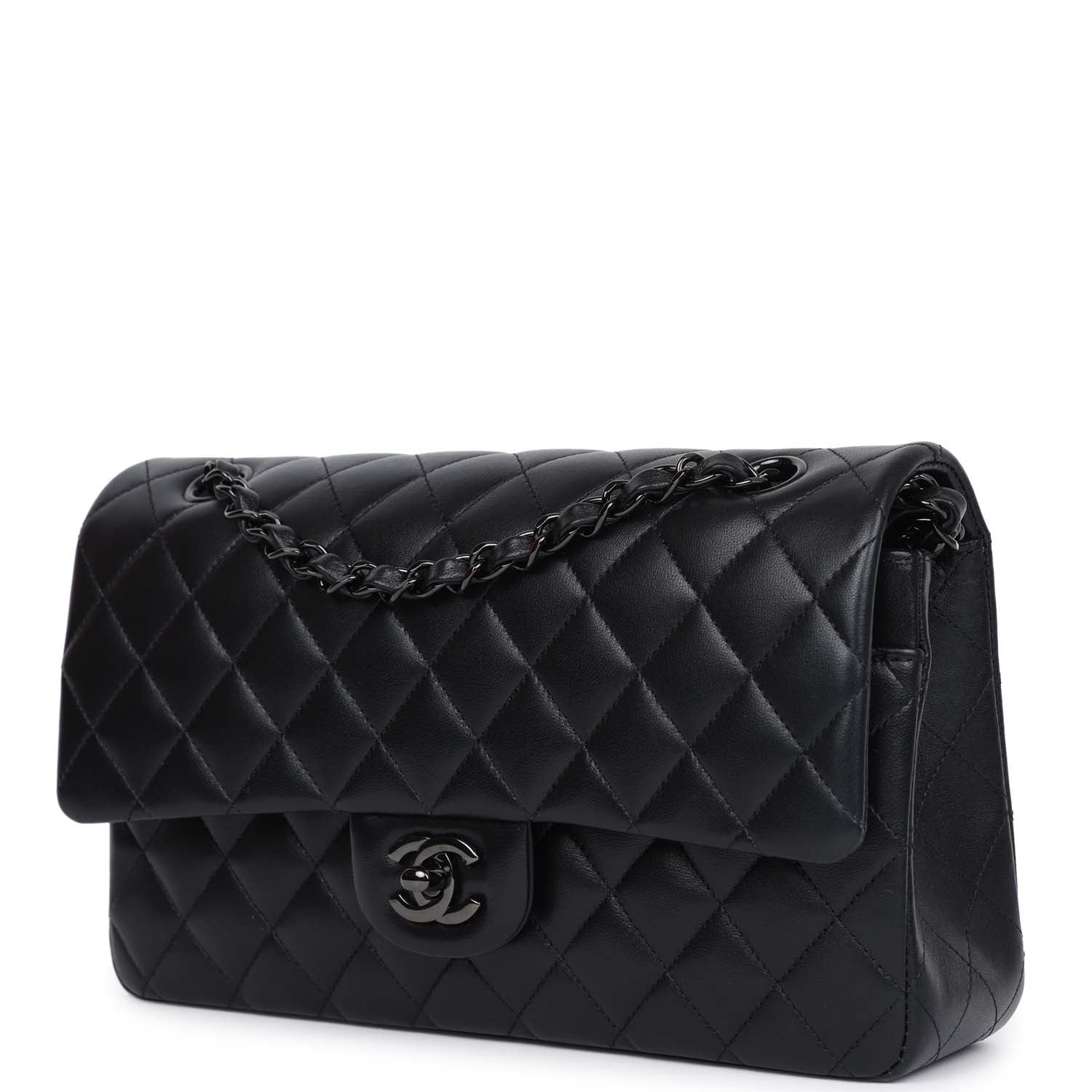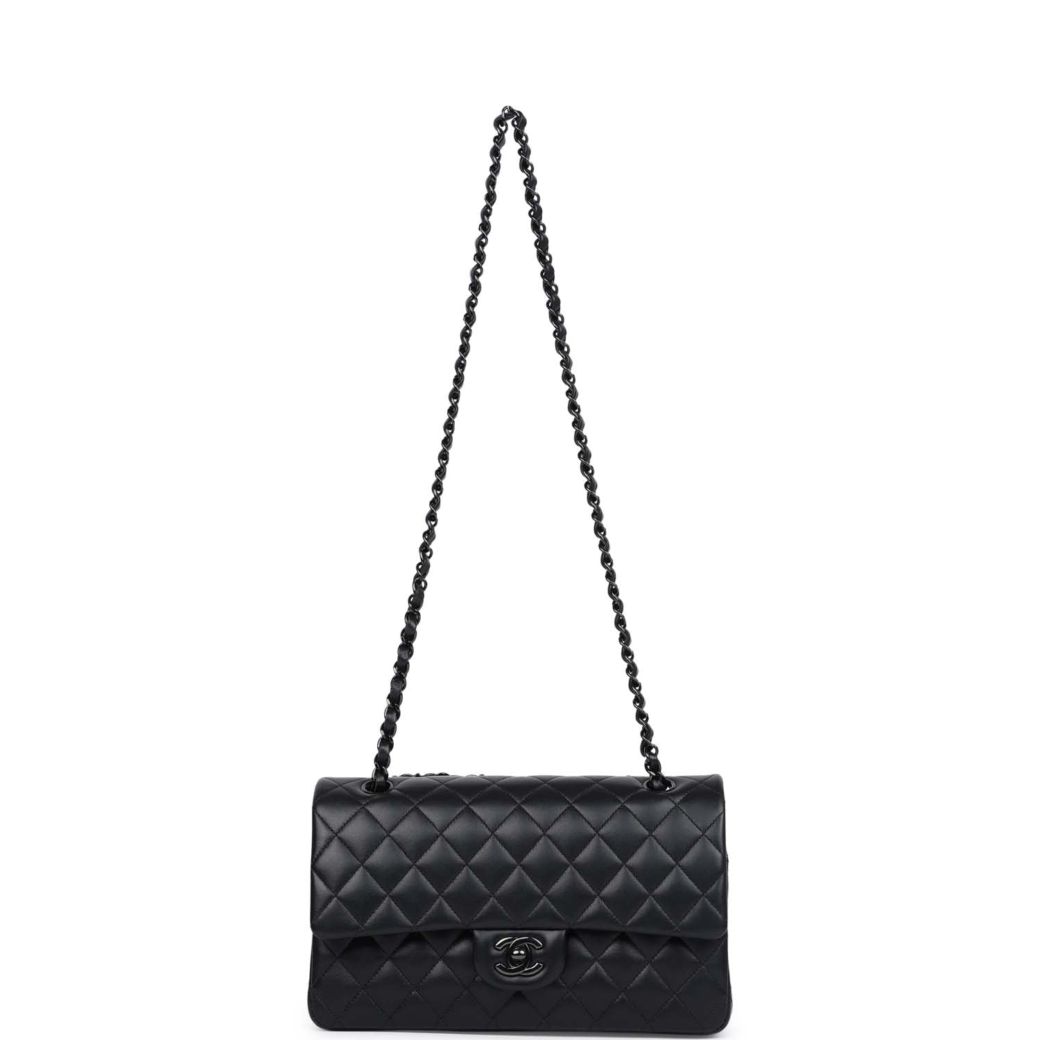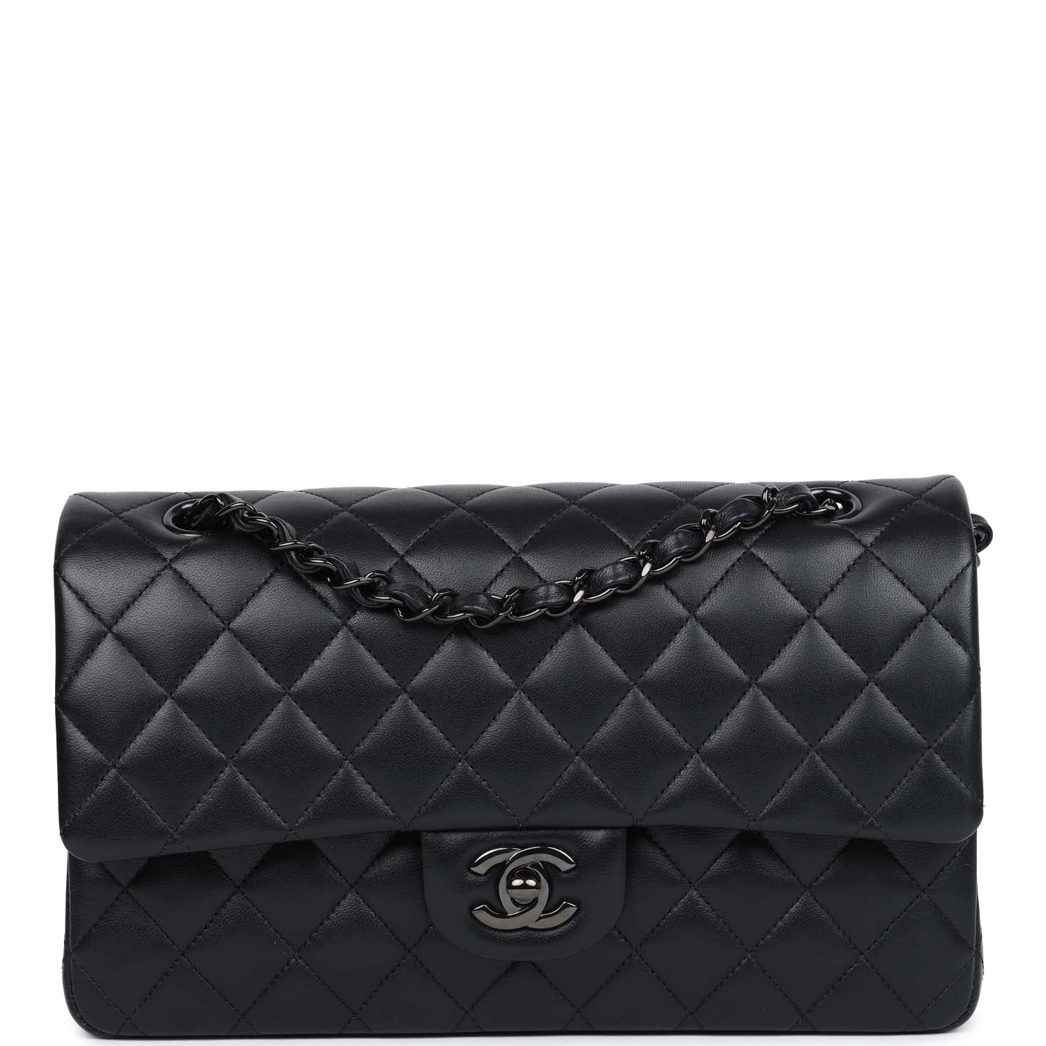 This Medium Classic Double Flap bag is in So Black lambskin leather with black hardware, front flap with CC turnlock closure, half moon back pocket, and an interwoven Black chain link and black leather shoulder/crossbody strap.