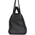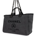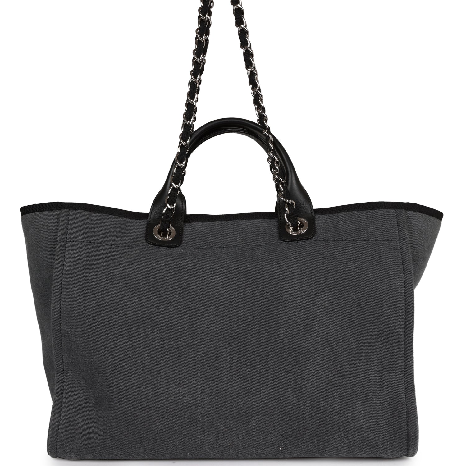 This Medium Chanel Deauville Tote is made of Dark Grey Denim with silver hardware, large CC signature and Chanel logo on front, interwoven silver tone chain link shoulder straps, and top handle.