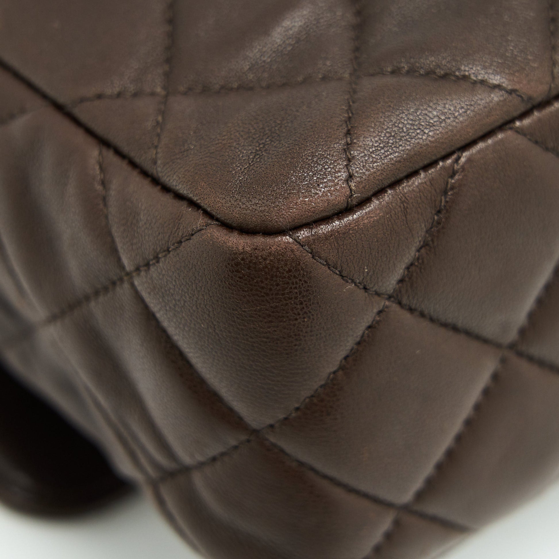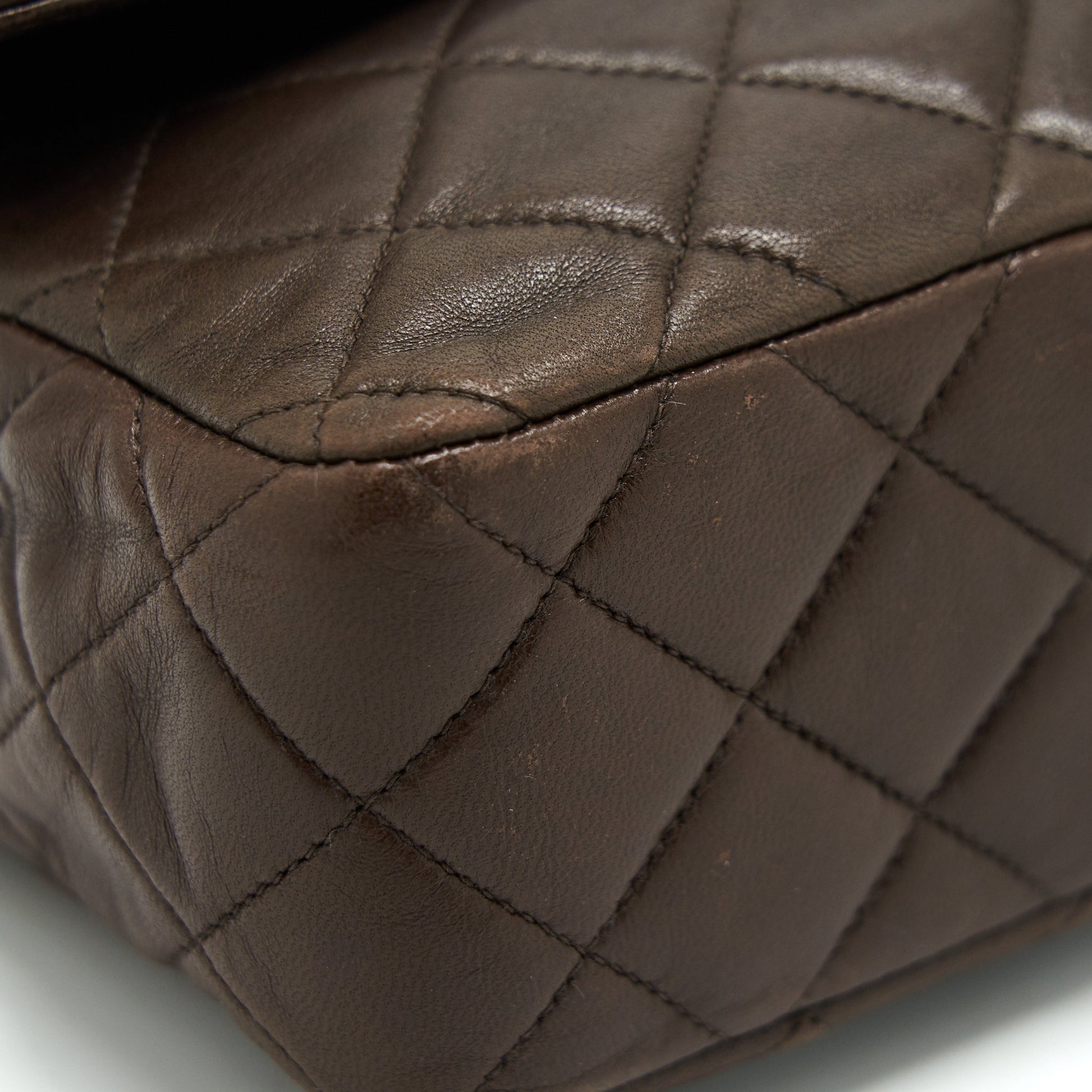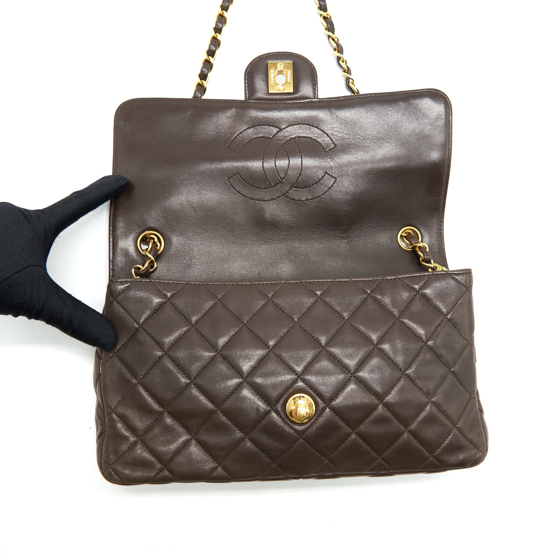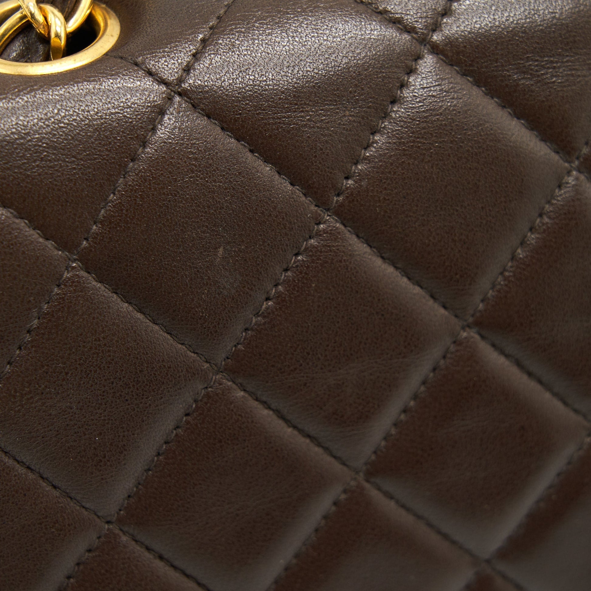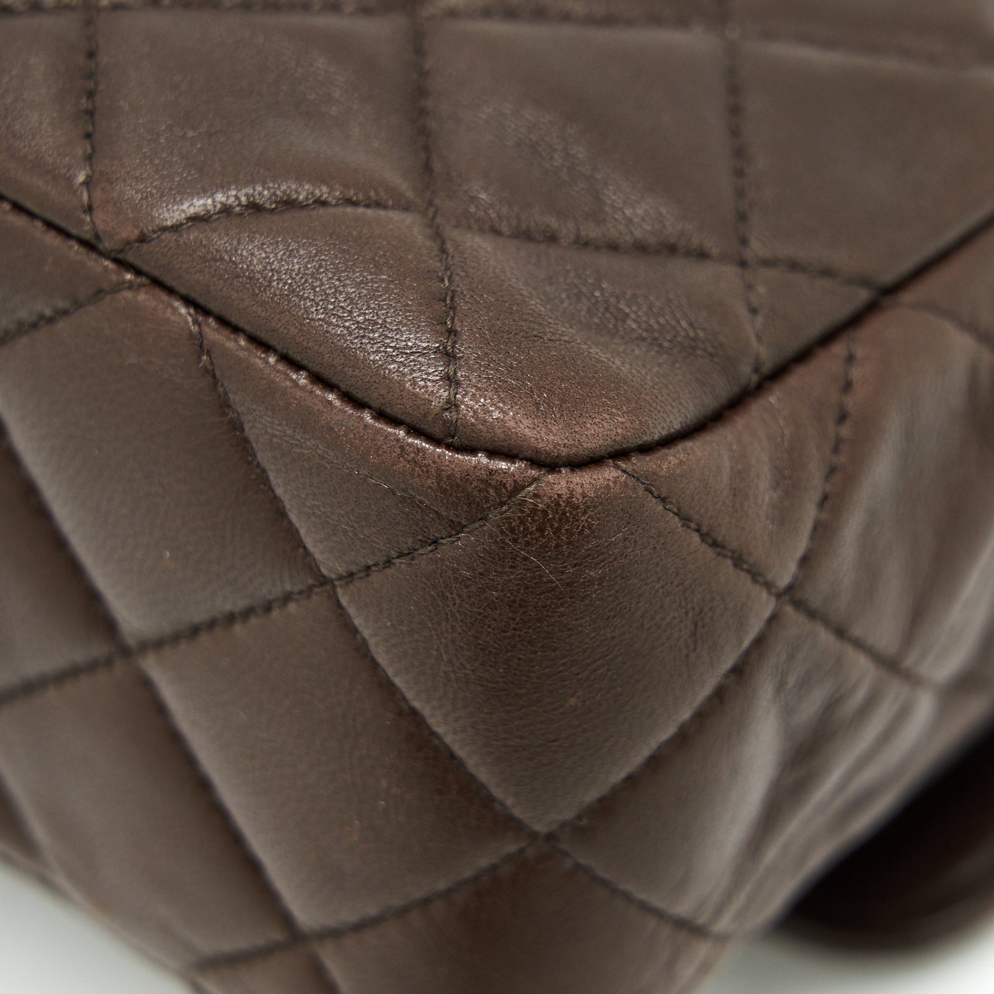 (This item is in fair condition with rubbing on edges and leather on chains, slight scratches under the flap and bottom side leather, sign of use inside, slight scratches on hardware, softened structure )